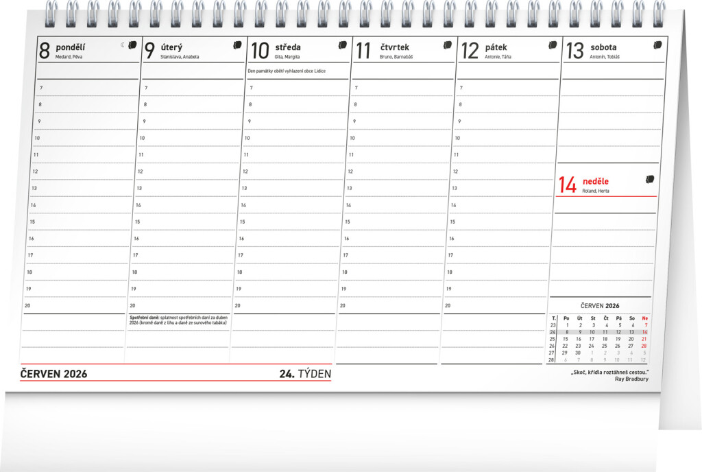 Prehľadný daňový kalendár, vďaka ktorému nezabudnete na žiadnu daňovú povinnosť, a navyše sa zoznámite s množstvom zaujímavých citátov slávnych osobností. Stĺpcové kalendárium obsahuje mesačný prehľad v každom týždni, znamenia zverokruhu, mená, sviatky a pamätné dni.