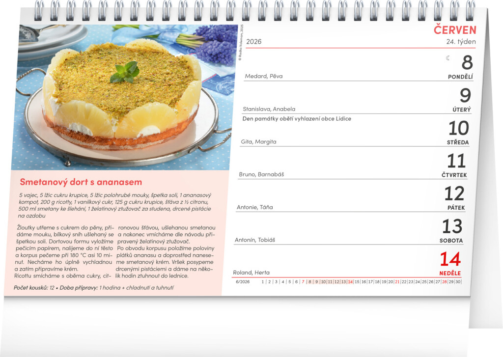 Kalendár s receptami na zákusky, múčniky aj „sladké bodky na záver“. Každý recept je doplnený fotografiou výsledného pokrmu. Týždenné kalendárium s priestorom pre poznámky obsahuje aj sviatky, pamätné dni, mesačné fázy a prehľad na celý rok 2026 a 2027.