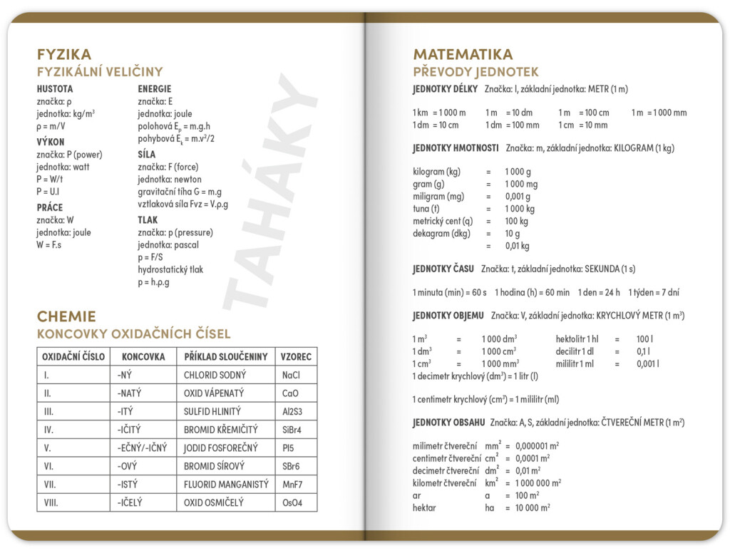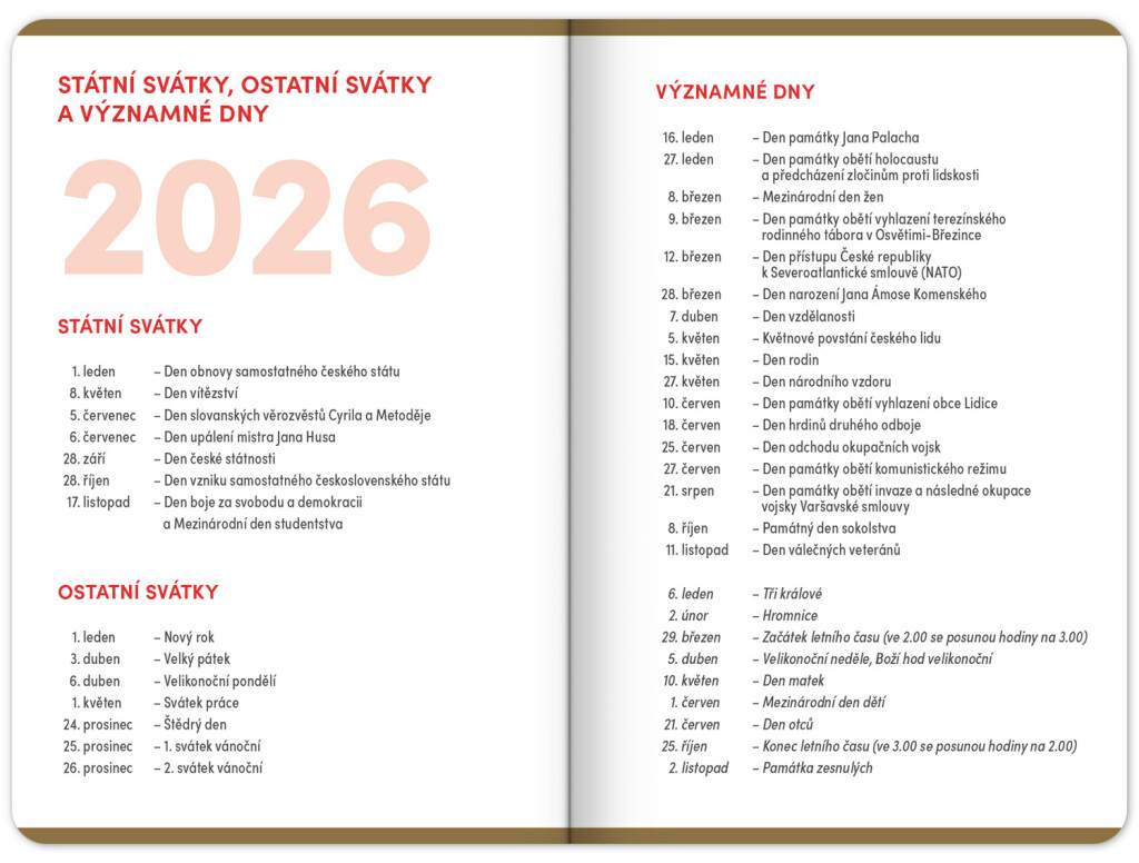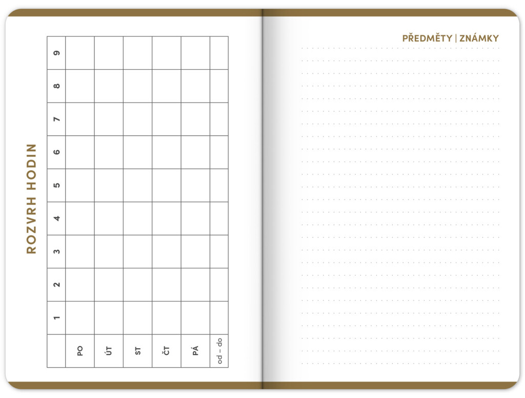 Študentský diár v minimalistickom čiernom dizajne obsahuje prehľad na rok 2025 a 2026, české týždenné riadkové kalendárium s menami a sviatkami, rozvrh hodín, priestor na poznámky a základné poznatky z matematiky, fyziky, chémie a angličtiny pre študentov. Kalendárium začína v septembri 2025 a končí v decembri 2026.