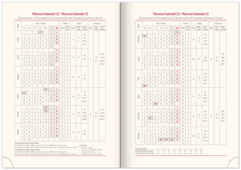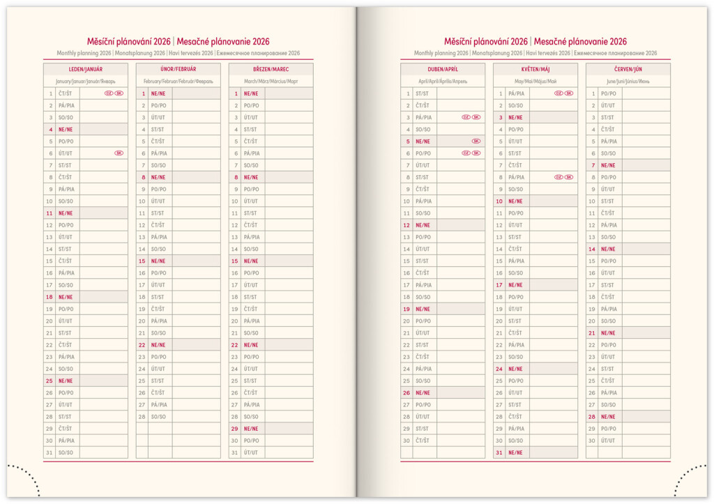 Nový rad diárov v modernom dizajne doplnenom o pevnú gumičku a pútko na pero. Týždenné rozloženie s česko-slovenským kalendáriom a doplnkovou angličtinou, nemčinou, maďarčinou a ruštinou.