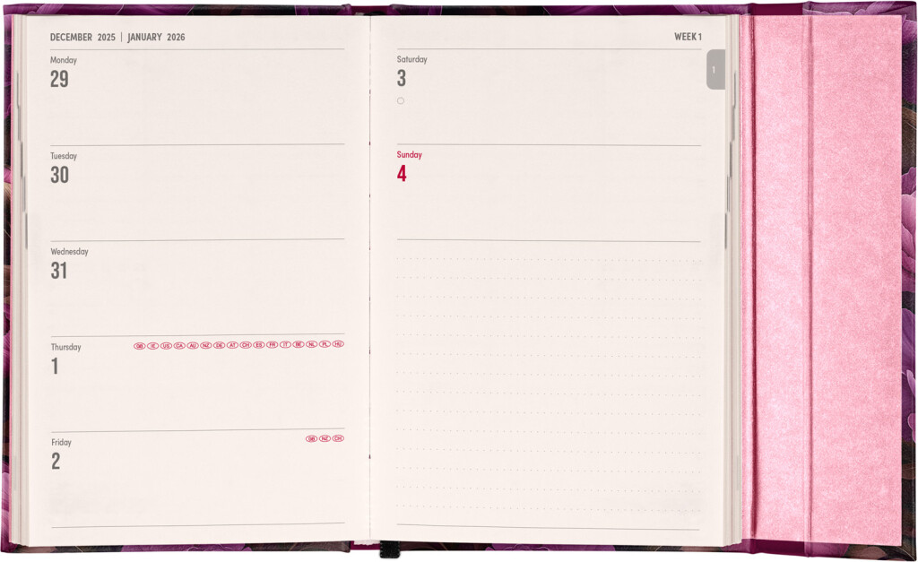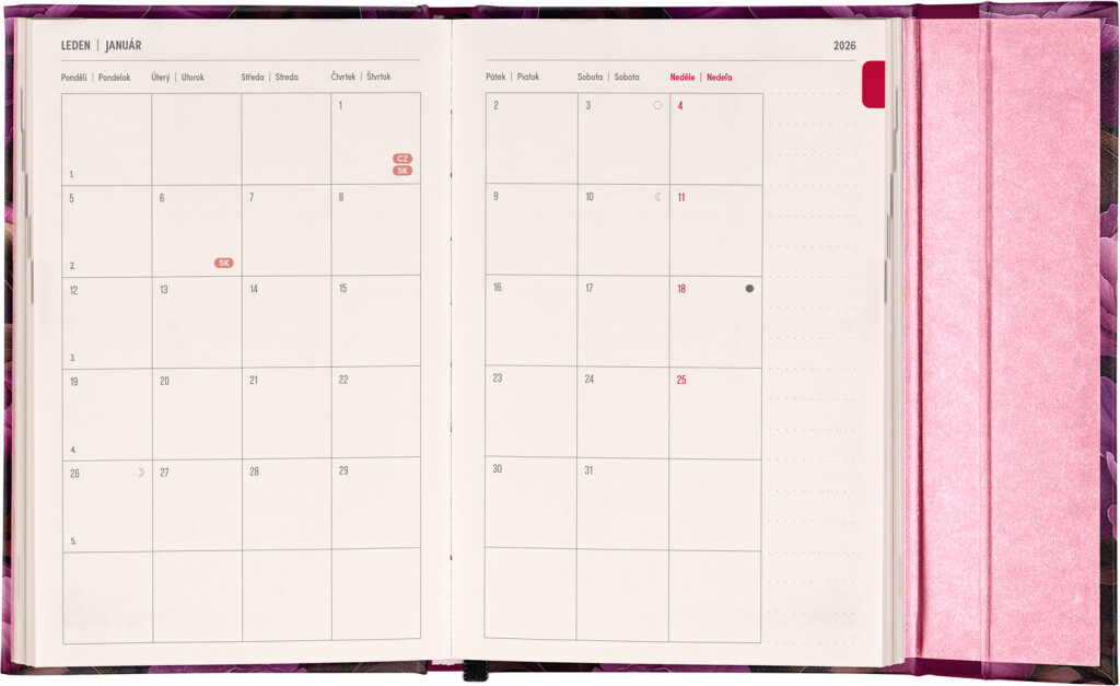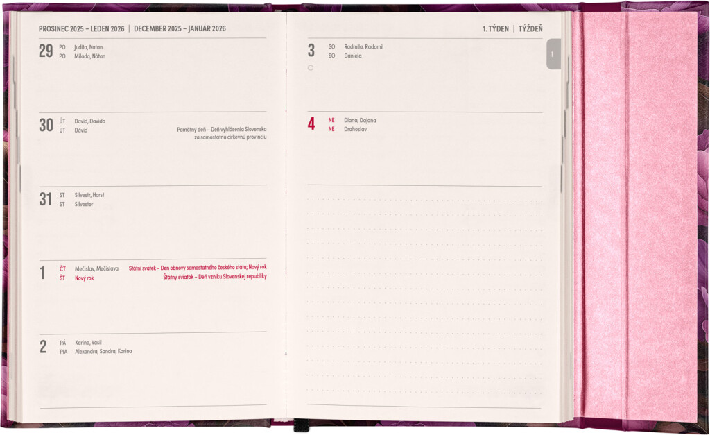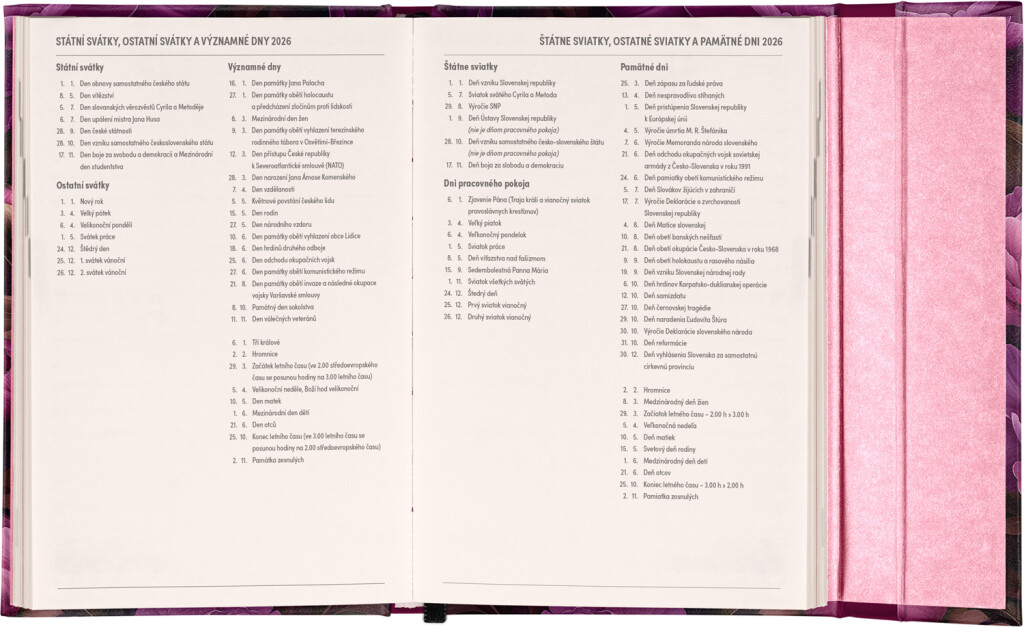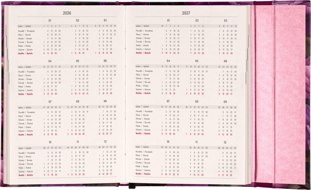 Týždenný diár v anglickom jazyku s medzinárodnými sviatkami a praktickým magnetickým uzatváraním je ideálnou voľbou pre tých, ktorí chcú mať svoje plány prehľadne pod kontrolou. Ponúka horizontálne rozloženie vo verzii týždeň na dvoch stranách s priestorom na poznámky. Súčasťou sú praktické mesačné prehľady, ideálne na plánovanie dovoleniek či prázdnin.