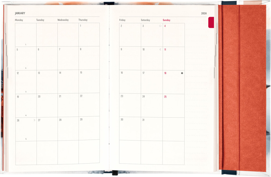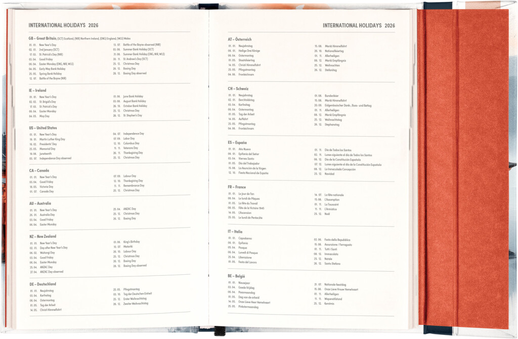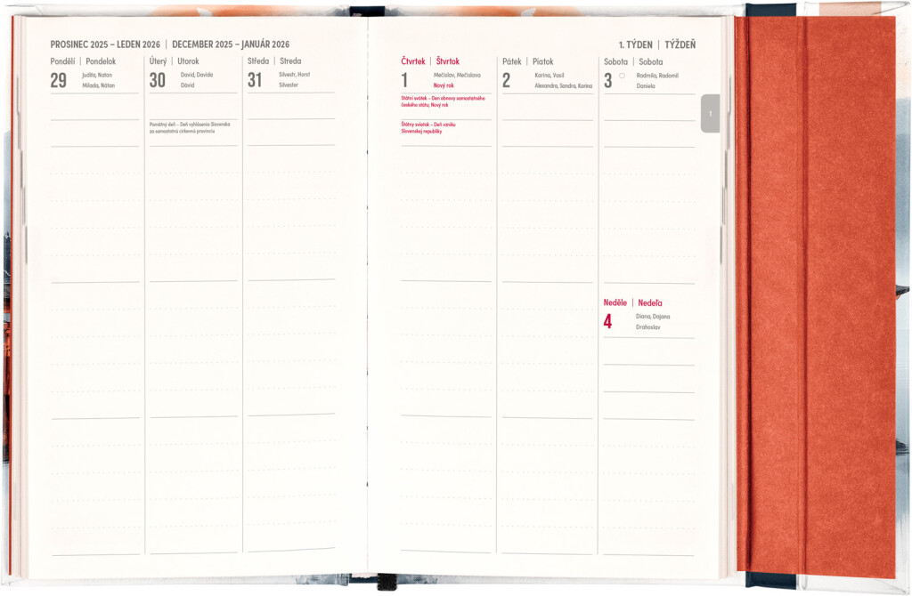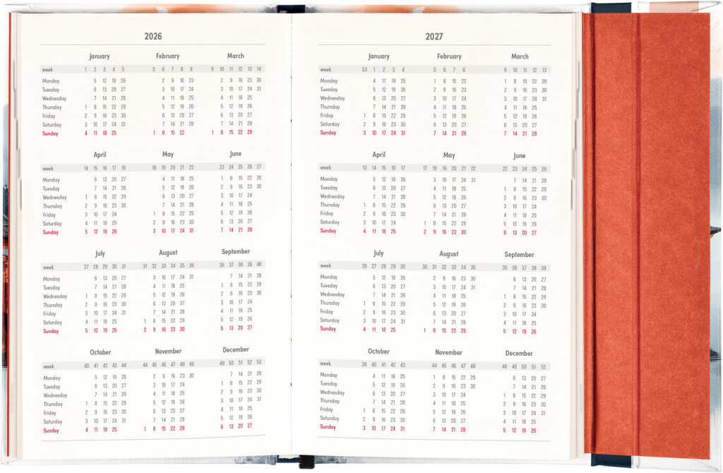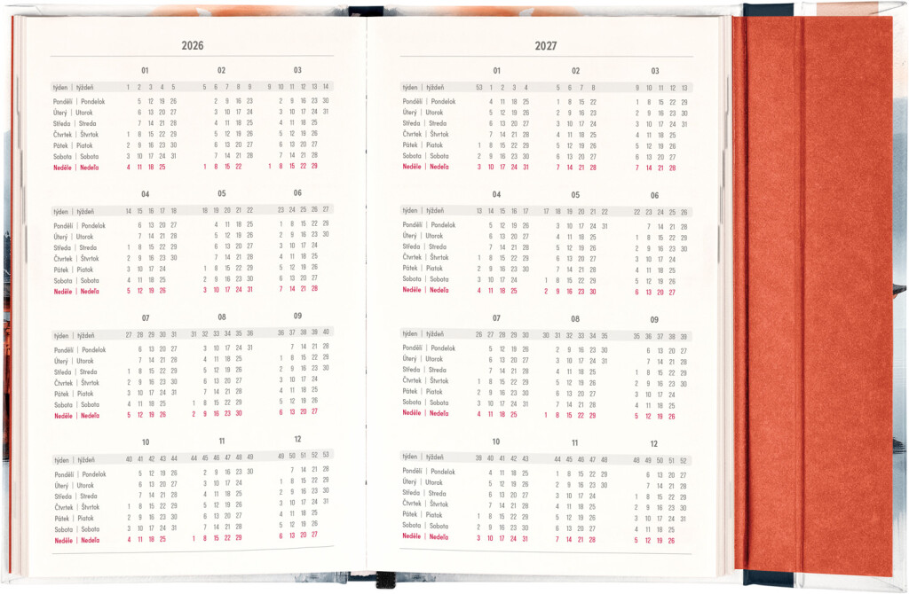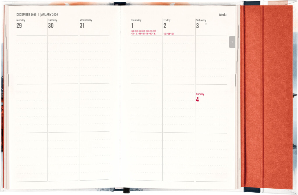 Týždenný diár v anglickom jazyku s medzinárodnými sviatkami a praktickým magnetickým uzatváraním je ideálnou voľbou pre tých, ktorí chcú mať svoje plány prehľadne pod kontrolou. Ponúka stĺpcové rozvrhnutie jednotlivých týždňov s dostatkom priestoru pre každodenné poznámky. Súčasťou sú praktické mesačné prehľady, ideálne na plánovanie dovoleniek či prázdnin.
