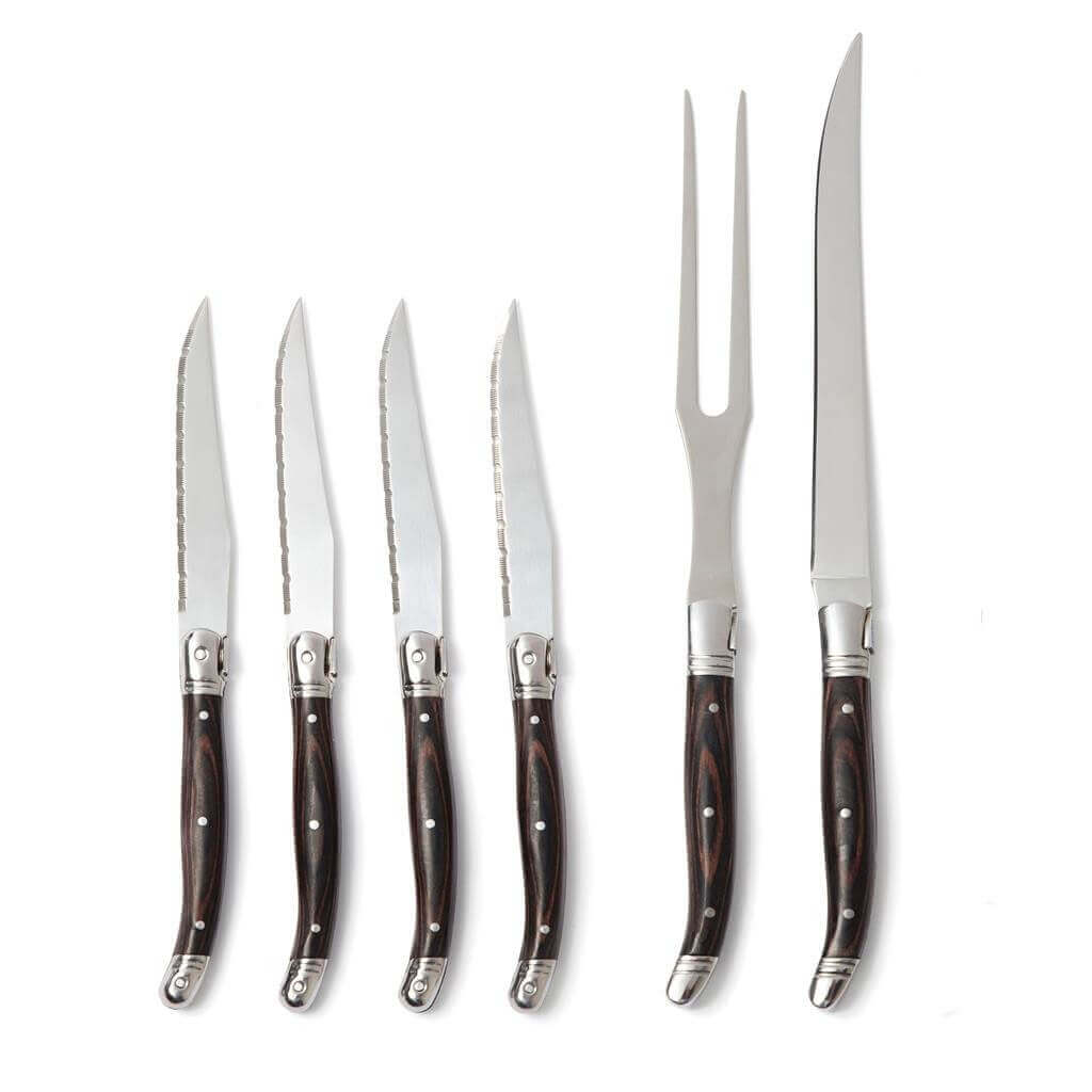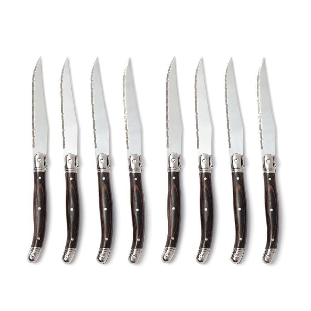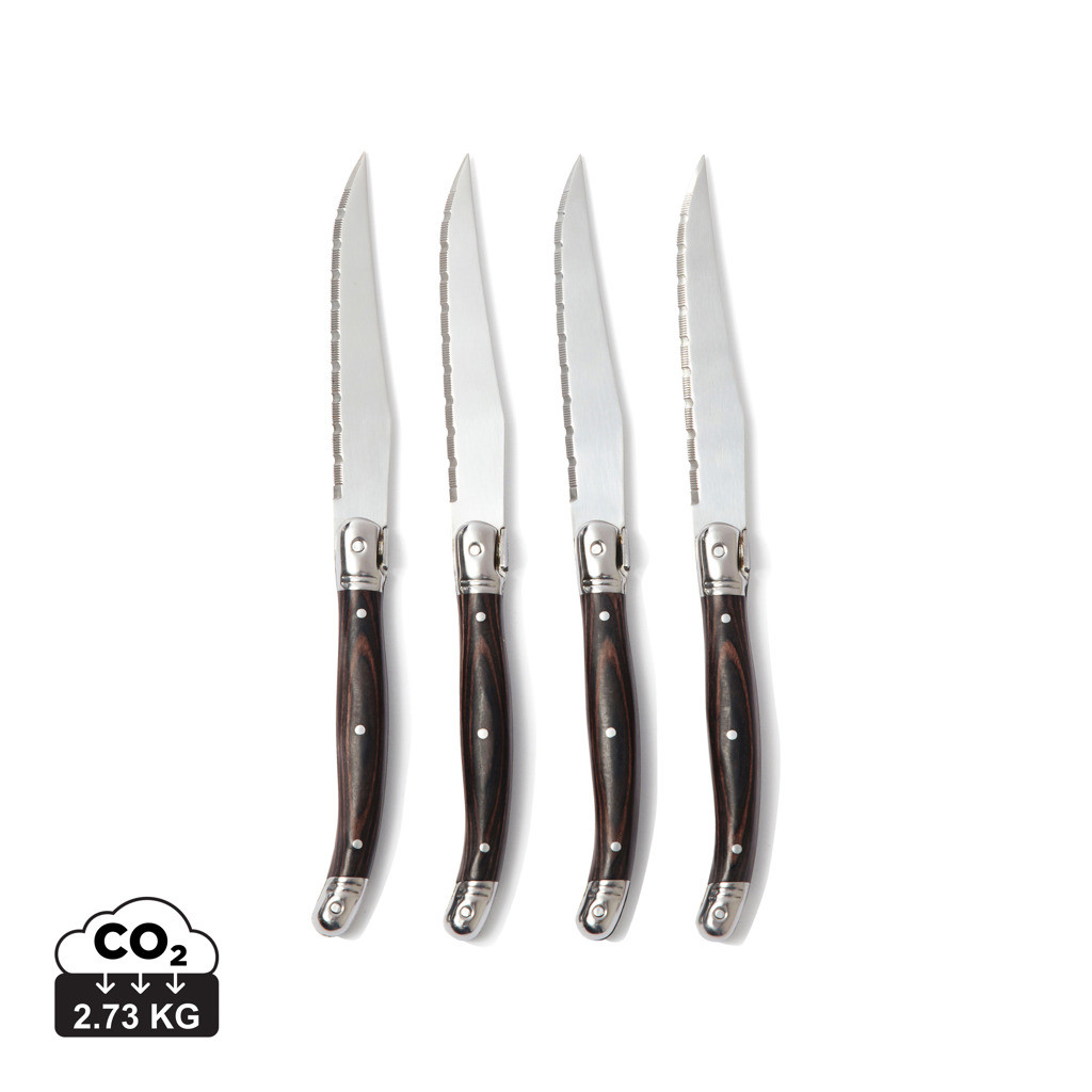 Vysoko kvalitné nože na mäso v typickom bistro štýle inšpirovanom Francúzskom. Rukoväť z čierneho dreva pakka a čepele z vysoko kvalitnej nerezovej ocele. Čepeľ má jemné zúbky, čo umožňuje krájať potraviny s čo najmenším odporom. Súprava štyroch nožov, ktoré môžete ľahko zladiť s domácimi vidličkami. Balené v exkluzívnej darčekovej krabičke.