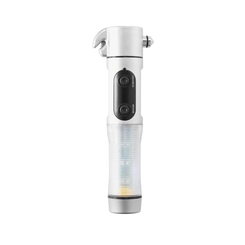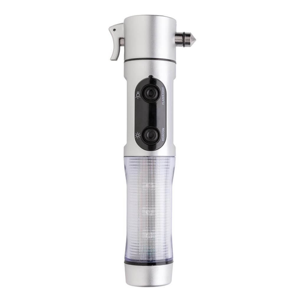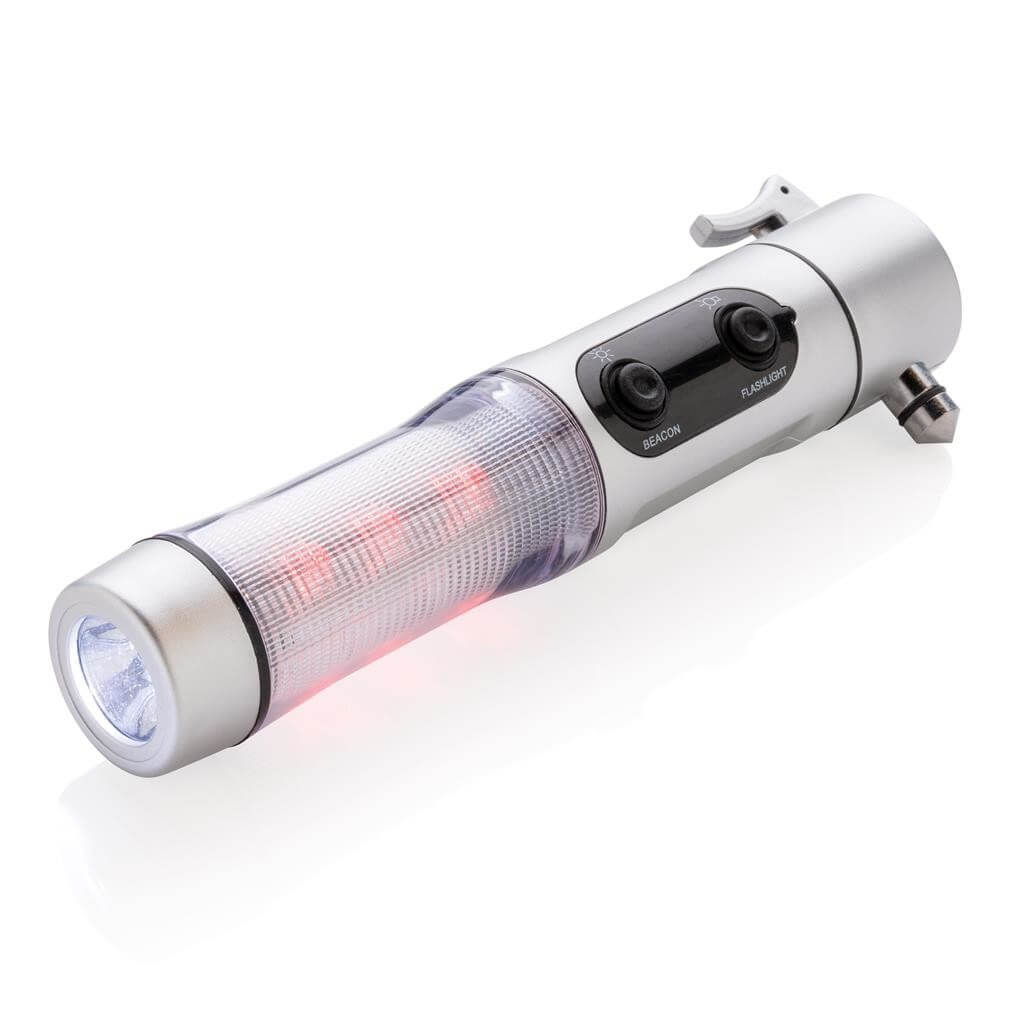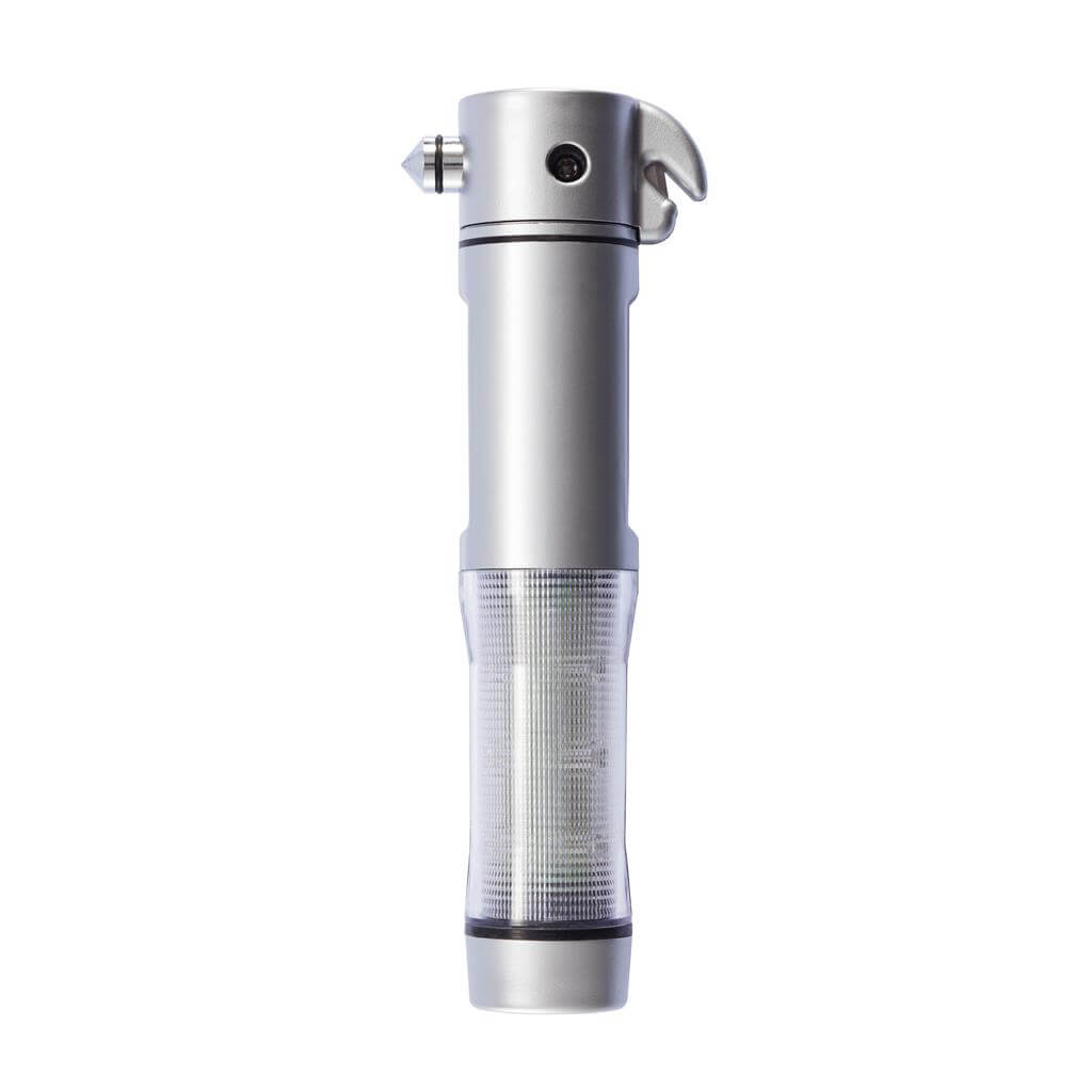 Núdzové svetlo, strieborné ABS puzdro, biela LED žiarovka a 9 červených zábleskových svetiel na boku, nôž, nástroj na rozbitie okna a magnetická základňa pre umiestnenie na strechu vozidla. 2 batérie typu AA sú súčasťou balenia.