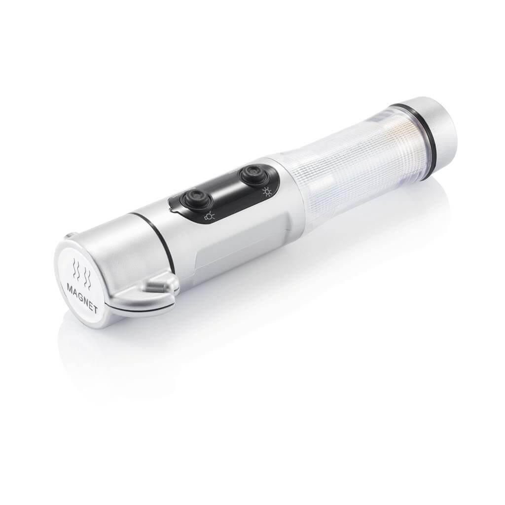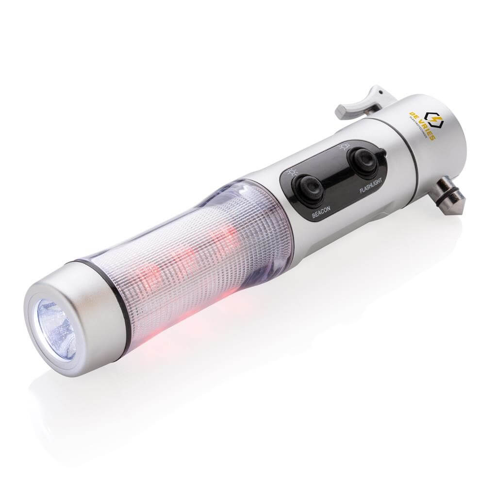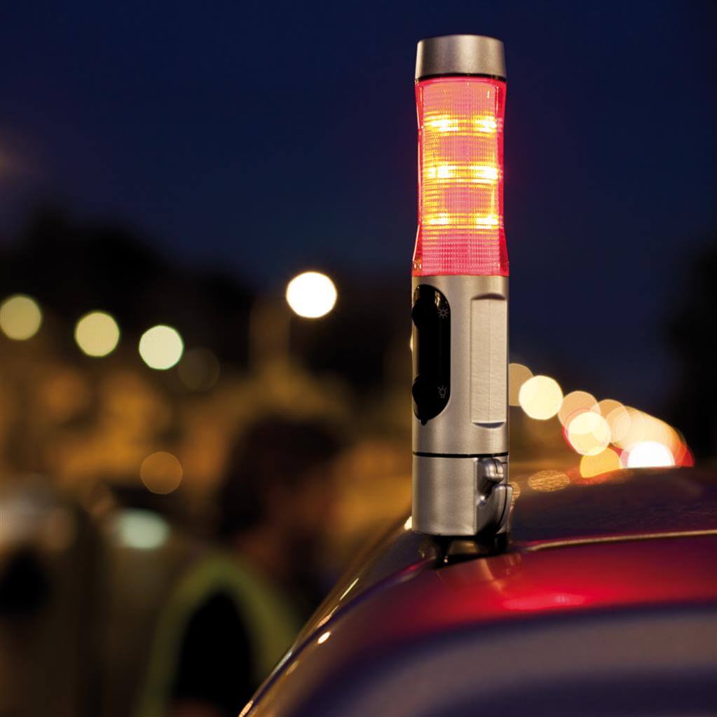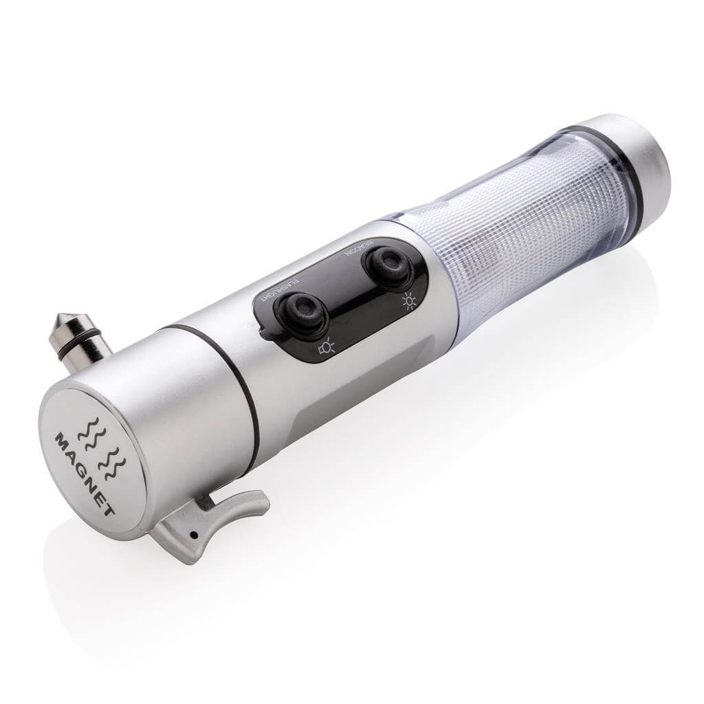 Núdzové svetlo, strieborné ABS puzdro, biela LED žiarovka a 9 červených zábleskových svetiel na boku, nôž, nástroj na rozbitie okna a magnetická základňa pre umiestnenie na strechu vozidla. 2 batérie typu AA sú súčasťou balenia.