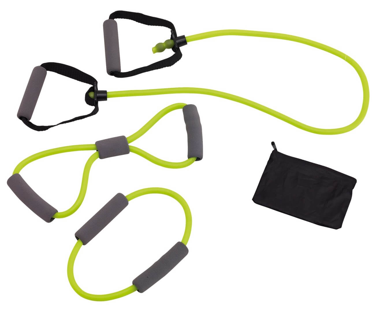 Odporové pásy na cvičenie SPORTS SPIRITS na posilnenie a vytvarovanie svalov: 3 elastické pásy na cvičenie v rôznych dĺžkach - vhodné pre cvičenie, tvarovanie a strečing, všetky pásy majú penové rukoväte, vo vrecku zo sieťoviny s plastovým uzáverom,