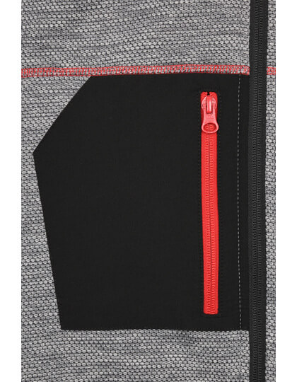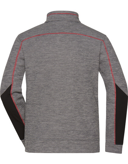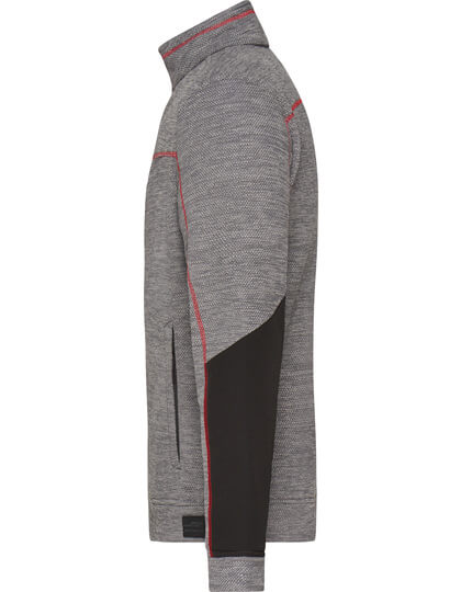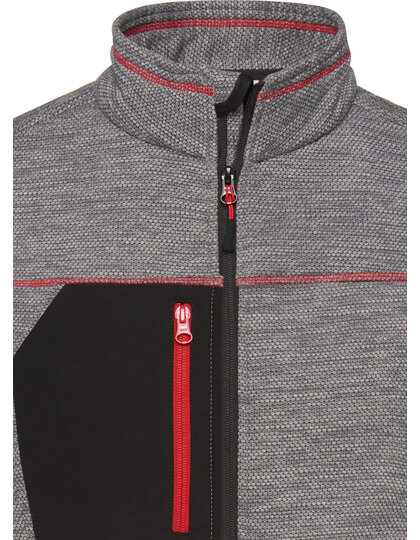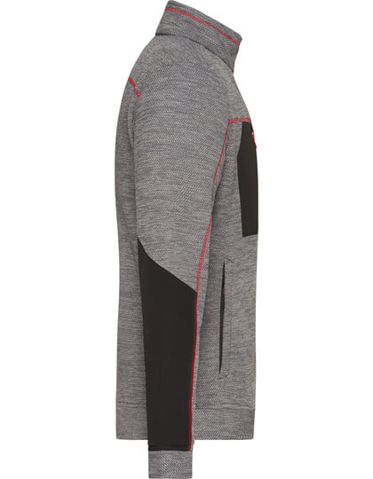 Pletená flisová bunda s ľahkou údržbou | Mäkká, teplá, ľahko udržiavateľná látka v melírovom vzhľade | Vonkajšia strana: Hladký, textúrovaný vzhľad | Vnútorná strana: Mäkký, našuchorený a česaný materiál | Dve bočné vrecká so skrytým zipsom, dve vnútorné vrecká | Náprsné vrecko z tkanej látky s kontrastným zipsom | Kontrastné šitie | stojačik | Po celej dĺžke skrytý zips s ochranou brady | Zipsy: YKK