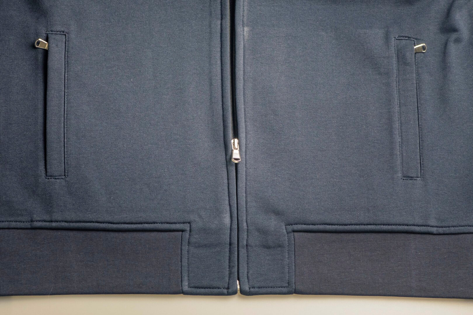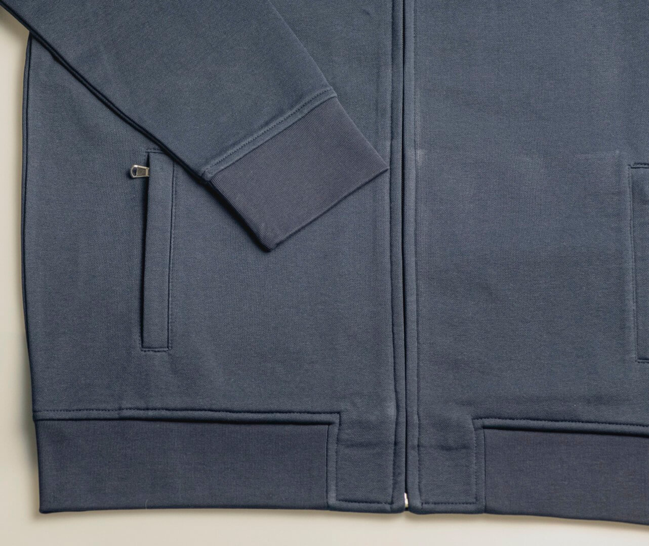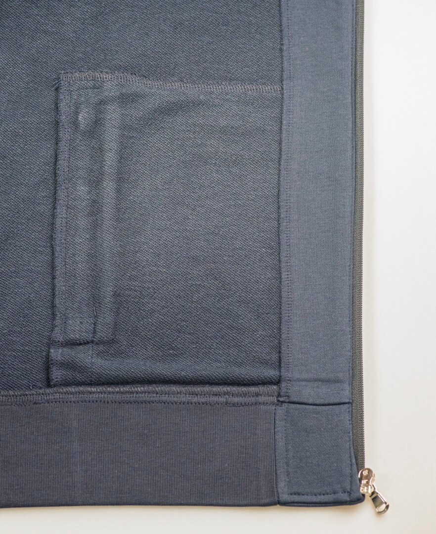 Česaná kruhovo dopriadaná bavlna / recyklovaný polyester (froté) | Moderné regular fit | Ochrana proti žmolkovaniu a zrazeniu, stálofarebné | 2 bočné vrecká na zips | S vysoko kvalitnými lemami, okrajmi vreciek a manžetami z 1x1 žebrovaného úpletu | Elegantný, ale robustný vzhľad | Priemyselné pranie | Bez štítkov
