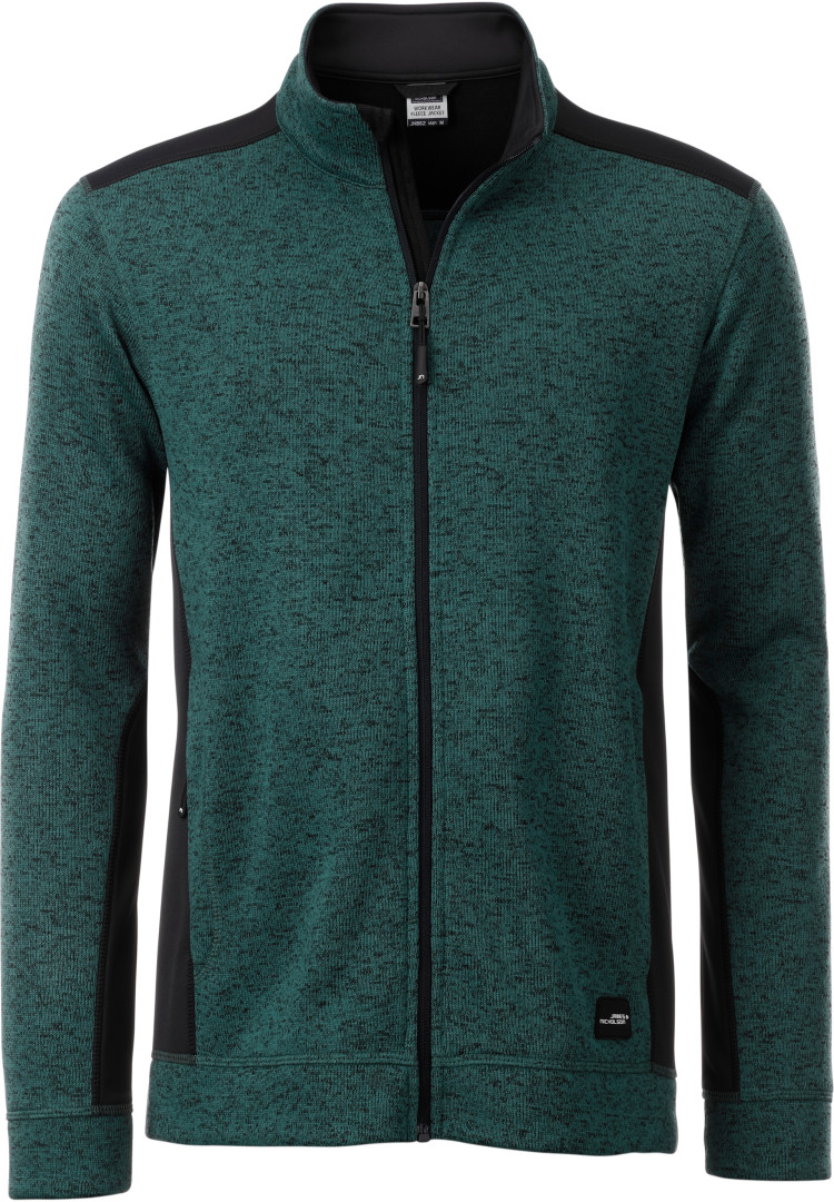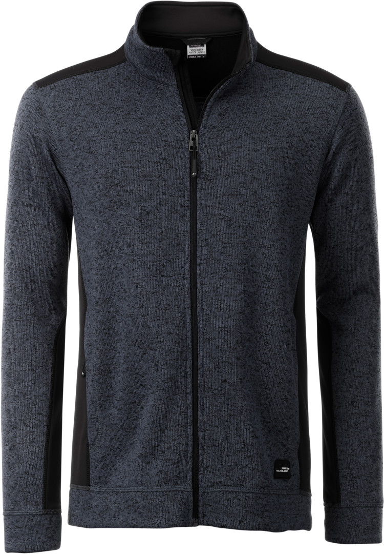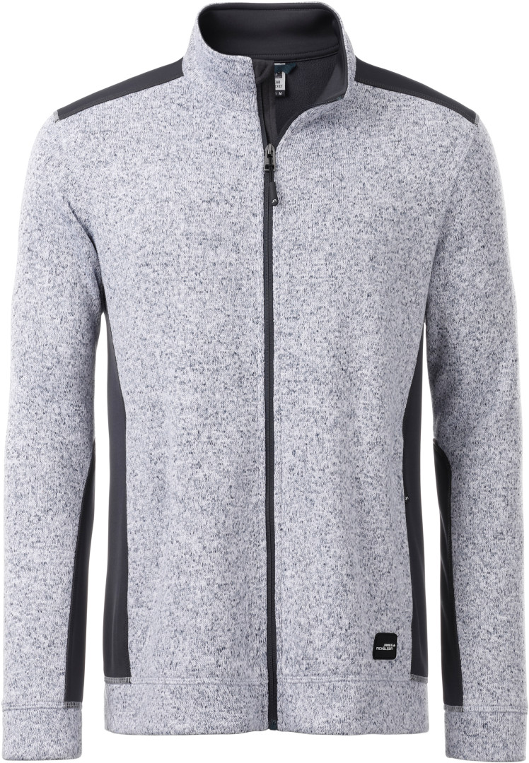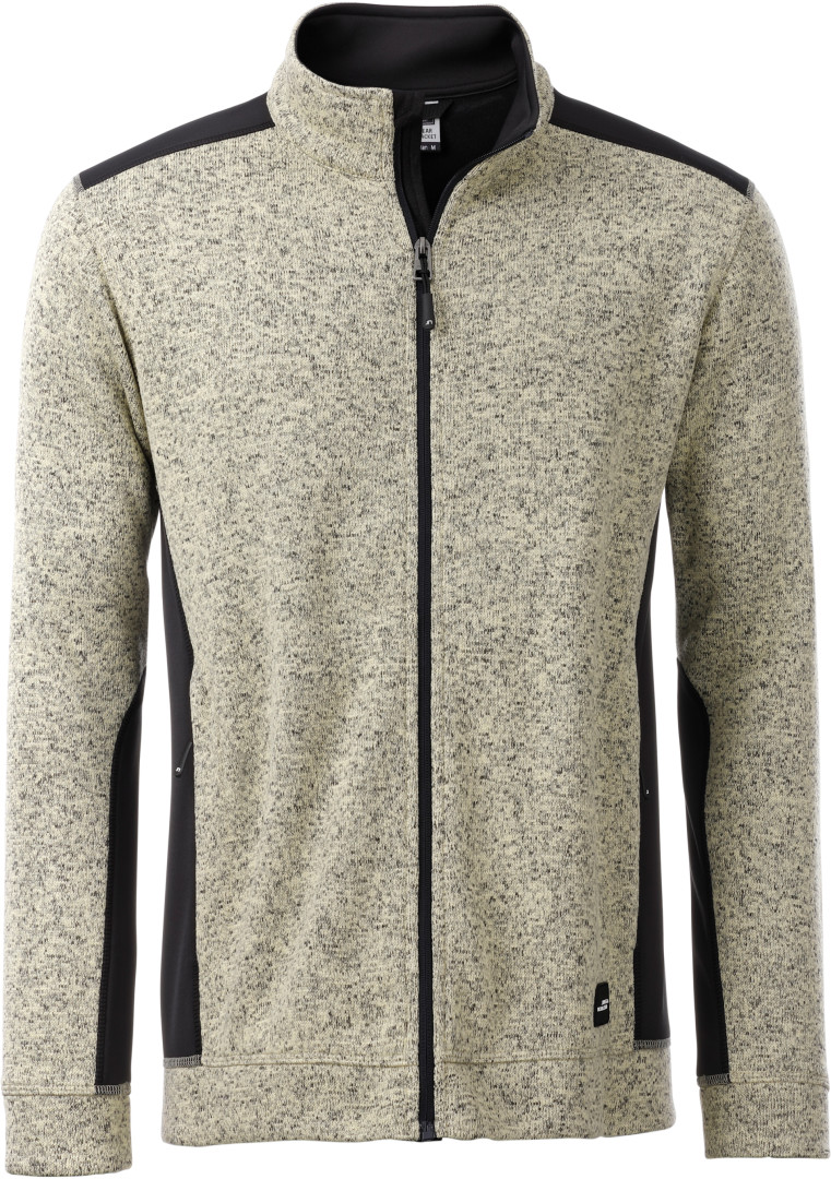 Stojačik, po celej dĺžke skrytý zips s ochranou brady a chlopňou proti vetru, elastické softshellové vklady na bokoch ramenách a rukávoch, 2 bočné vrecká so skrytým zipsom, teplá a mäkká tkanina v melírované vzhľadov, ľahká na údržbu, vonkajšia strana v pletenom vzhľade, vnútorná strana načechraná.