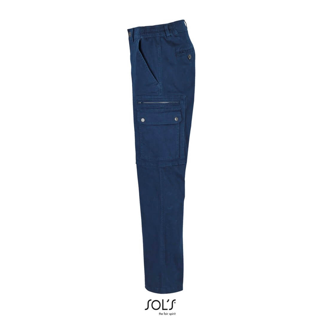 Moderný strih | Strečový keper | Elastický pás so zosilnenými pútkami na opasok | Zips a kovový gombík | 2 talianske vrecká | 2 bočné nakladané vrecká s klopou a patentkami | 2 zadné lemované vrecká s gombíkovou dierkou | 1 vrecko na lístky | Odtrhávací štítok