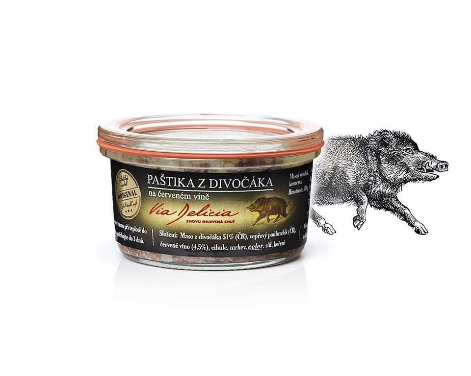 Paštéta z diviaka na červenom víne Via Delicia je pravá zverinová delikatesa, ktorá vyniká vôňou divokého korenia a jalovca. Dobre roztierateľná paštéta poteší každého milovníka mäsa. Pripravená z mäsa z diviaka, bravčového mäsa, zeleniny a červeného vína. Skvelá na pečivo aj studené misy.