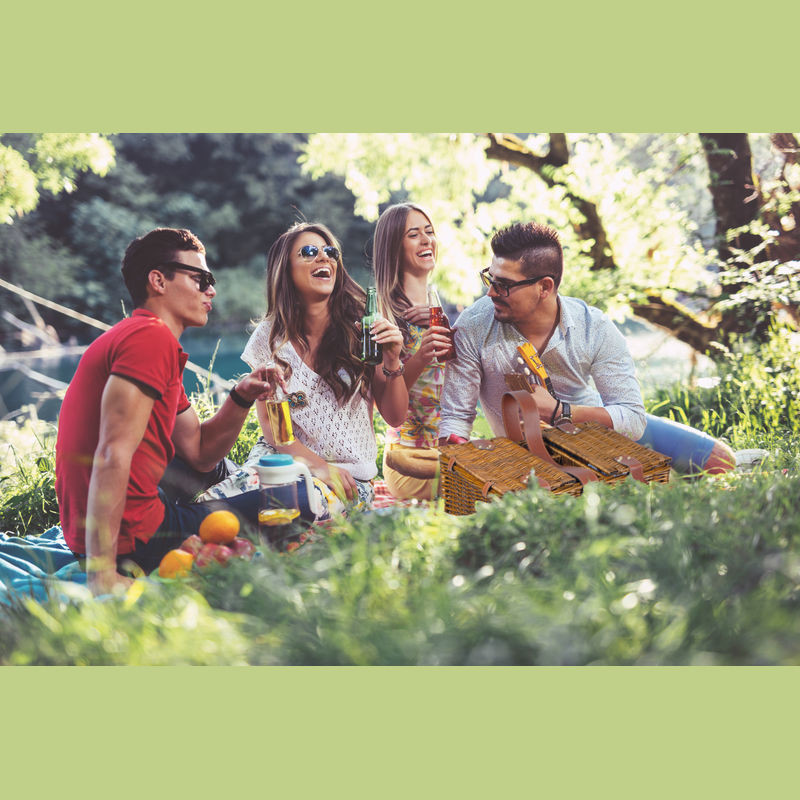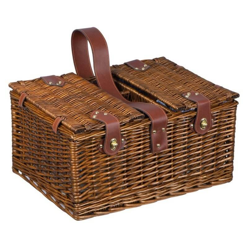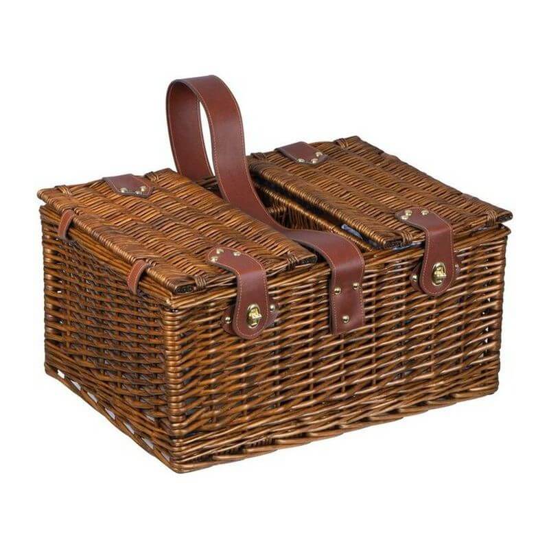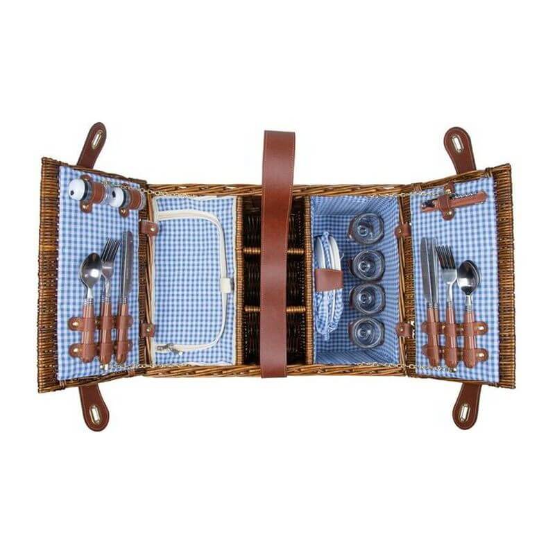 Prútený piknikový kôš pre 4 osoby. Košík obsahuje 4 poháre, 4 porcelánové taniere, 4 látkové obrúsky, 12-dielny príbor, koreničku a soľničku, 3 priehradky na fľaše, čašnícky nôž, integrovanú chladiacu priehradku a popruh na pohodlné prenášanie.
