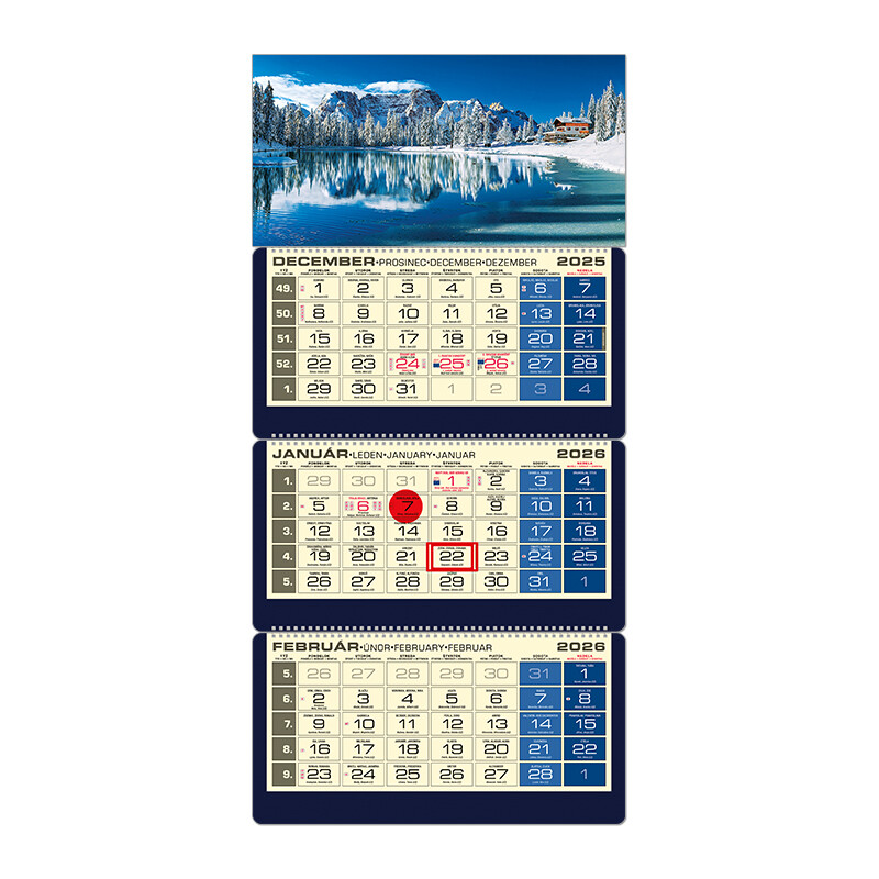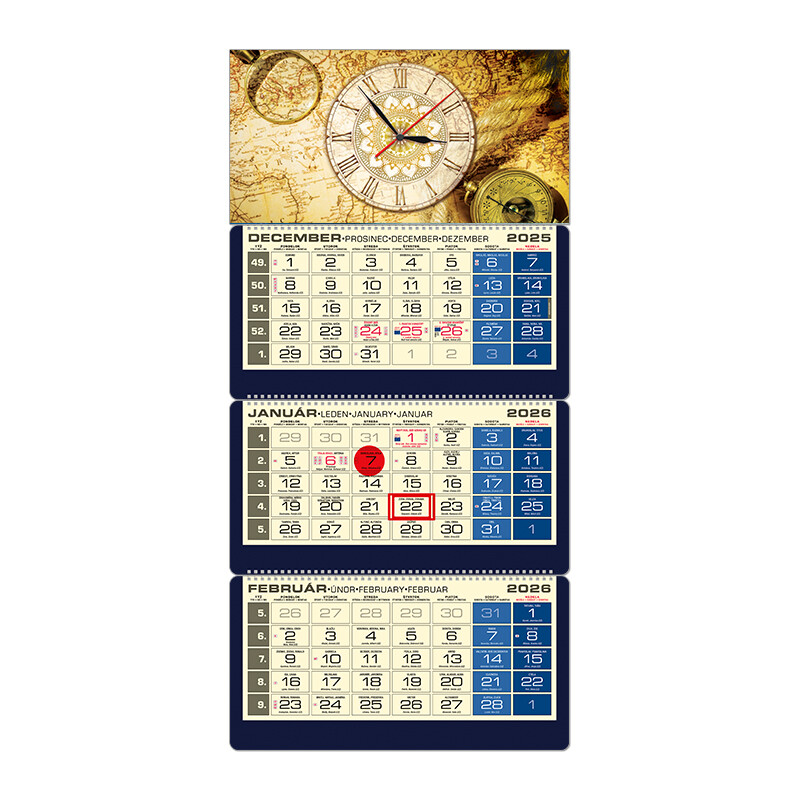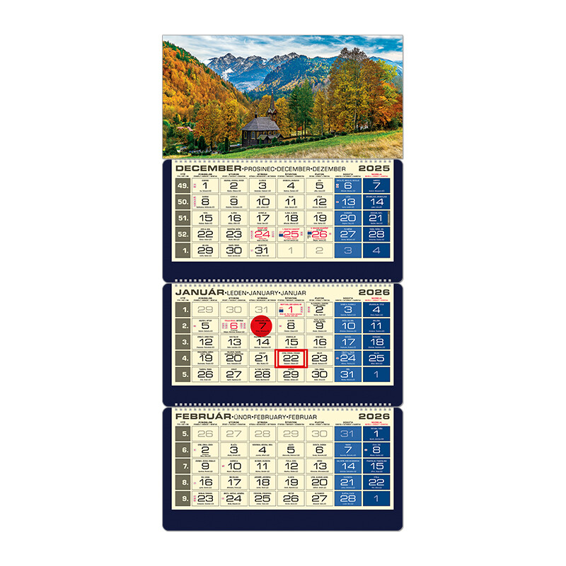 Luxusný trojdielny kalendár s menami v SK + CZ, názvy mesiacov a dní v SK, CZ, UK a DE. Súčasťou kalendárov LUXUS je "elektrostatický označovač" a 13. list s prehľadom všetkých sviatkov EÚ.