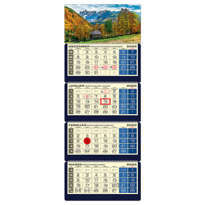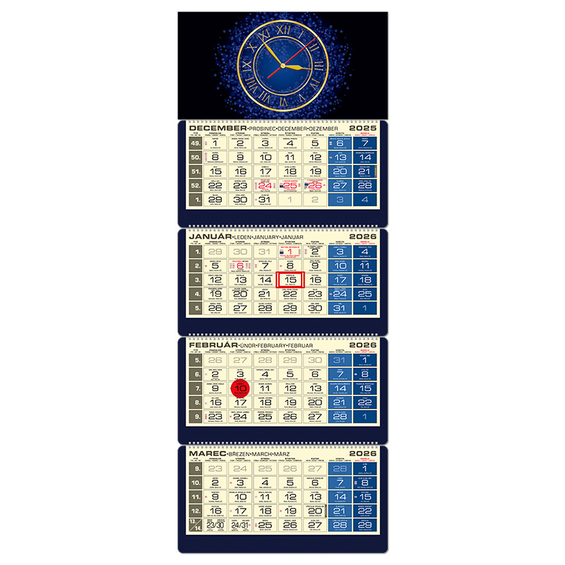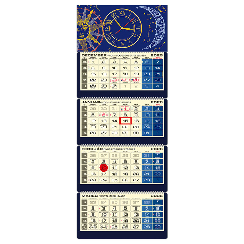 Luxusný štvordielny kalendár s menami v SK + CZ, názvy mesiacov a dní v SK, CZ, UK a DE. Súčasťou kalendárov LUXUS je "elektrostatický označovač" a 13. list s prehľadom všetkých sviatkov EÚ.