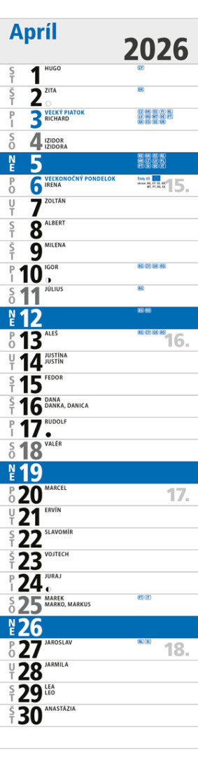 Moderný a prehľadný nástenný kalendár v modrom dizajne ponúka praktické mesačné kalendárium s menami SK, sviatky SK+ EU, fázy mesiaca. Ideálny pomocník pre každodenné plánovanie, pripomienky narodenín, menín či dôležitých udalostí počas celého roka.
