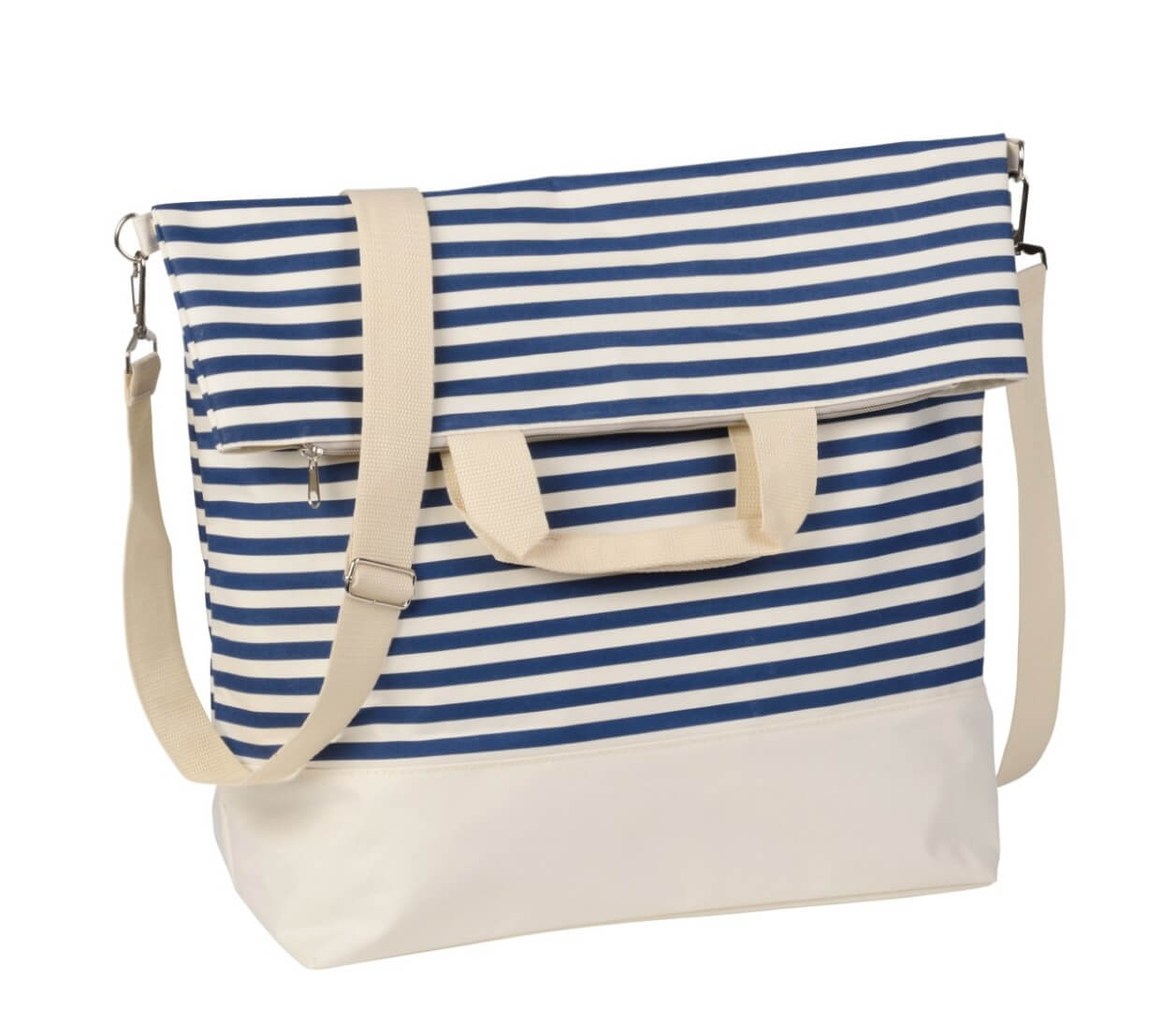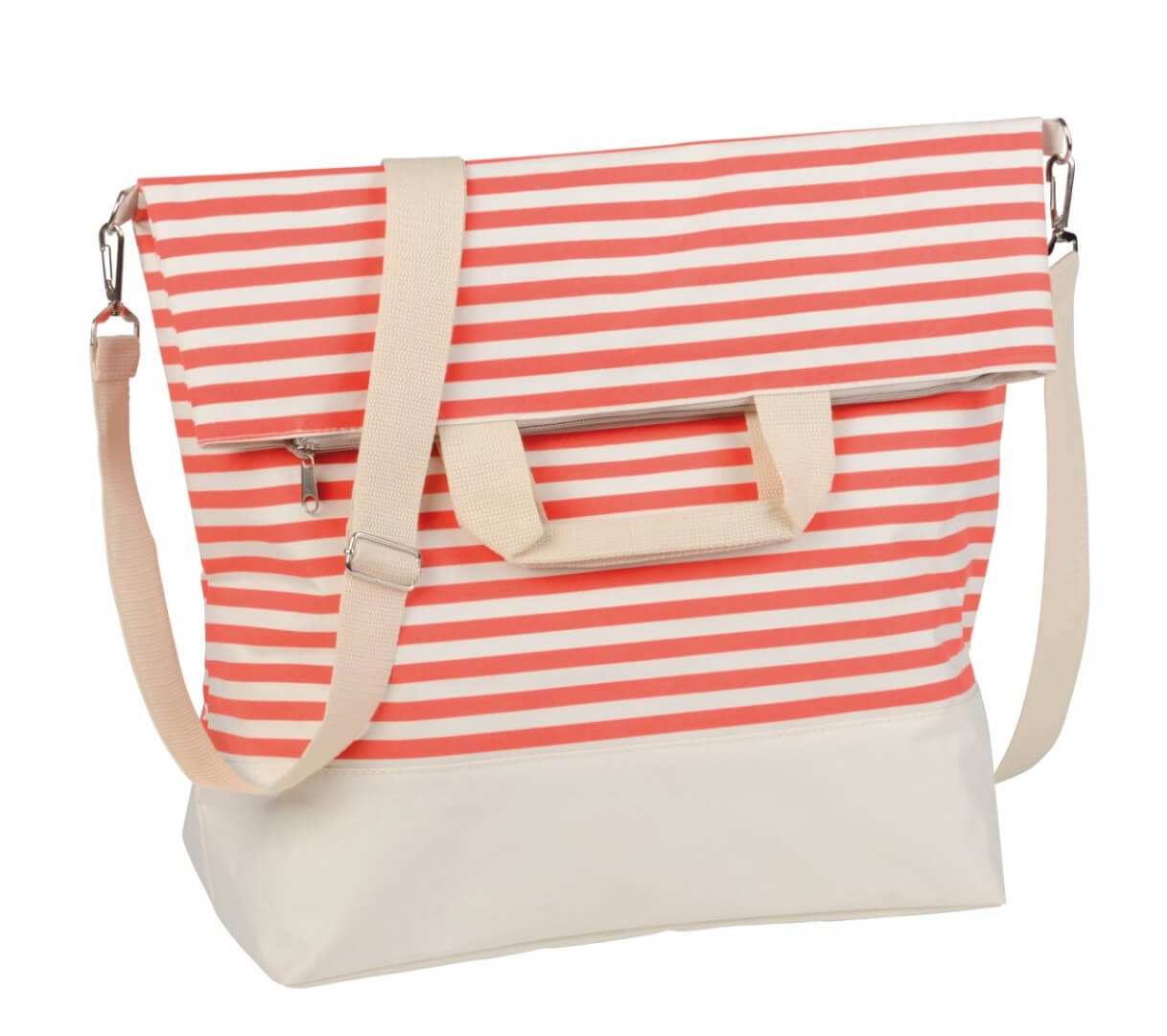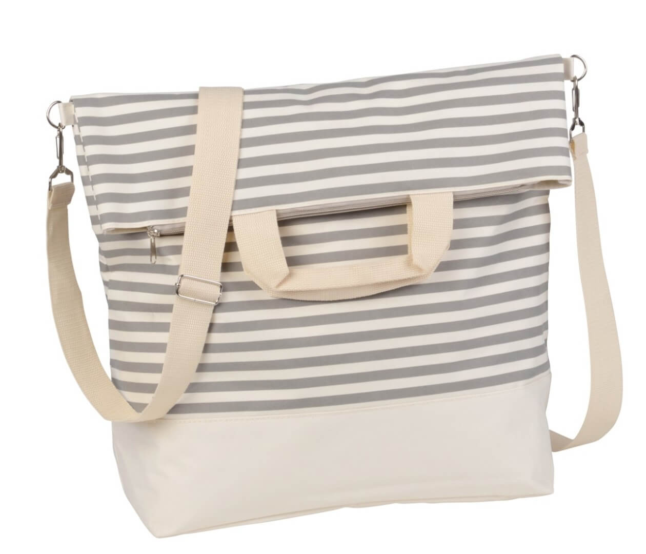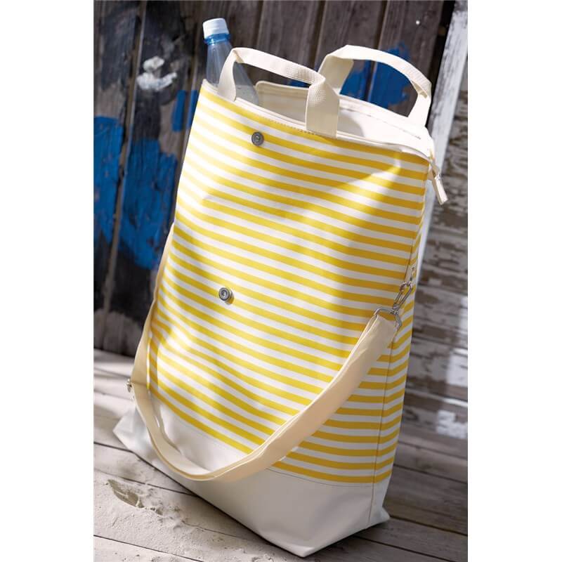 Plážová taška JUIST: priestranná hlavná priehradka na zips, 2 pohodlné rukoväte, nastaviteľný a odnímateľný ramenný popruh, objem tašky môže byť znížený o cca. 25% sklopením hornej časti a pripevnením magnetického uzáveru