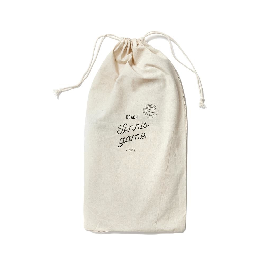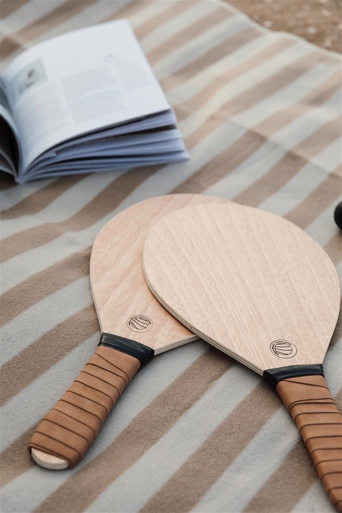 Elegantná súprava na plážový tenis z topoľového dreva s rukoväťami z vegánskej kože pre pohodlnejšie držanie. Hra, ktorá sa ľahko učí a je vhodná pre malých aj veľkých. Obsahuje dve rakety a dve gumené loptičky, zabalené v plátennej taške, vďaka ktorej sa ľahko prenáša so sebou.