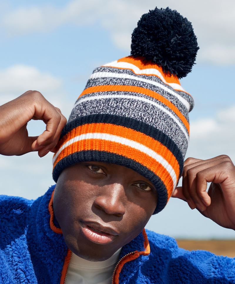 Jednofarebná brmbolca, široký lem, pruhovaný dizajn, dvojito pletená, mäkká a teplá, štítok TearAway, ručné pranie, nemožno sušiť v sušičke, nemožno chemicky čistiť.