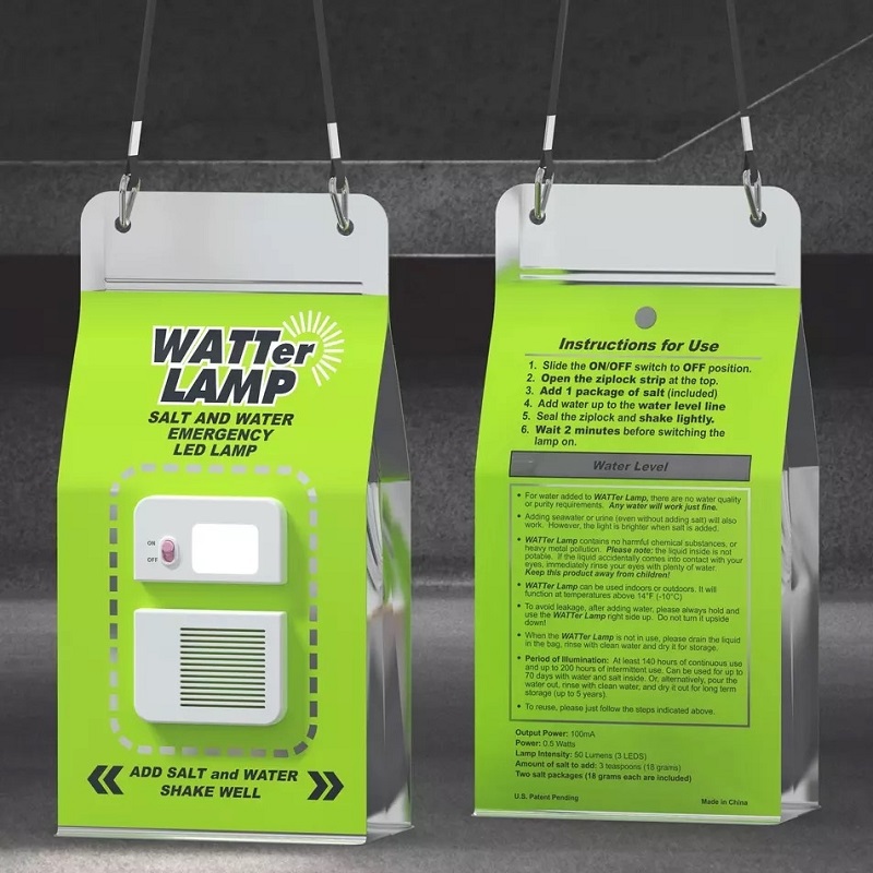 Unikátna pomôcka na táborenie, kempovanie a turistiku - elektrická lampa, ktorá svieti a nepotrebuje ani batériu, ani pripojenie do elektrickej siete. Stačí len naplniť vodou a pridať lyžicu kuchynskej soli! Chemická batéria vo svietidle dokáže za pomoci slaného roztoku svietiť niekoľko desiatok hodín. Slaný roztok je možné zo zásobníka vymyť a svietidlo tak používať opakovane. K dispozícii sú v záklanom balení aj dve dávky soli, takže sa nemusíte báť, že ju budete musieť v prírode zháňať. Navyše batéria je schopná viac-menej fungovať na akýkoľvek roztok obsahujúci minerálne soli, napr. morskú vodu, alebo v prípade najvyššej núdze môžete zásobník naplniť aj vlastným močom - skrátka lampa do extrémnych podmienok! Lampa má záves na nosenie na batožine, alebo si ju môžete zavesiť na krk. Zásobník má dvojité tesnenie, takže sa nemusíte báť, že z neho bude pri chôdzi unikať voda alebo nejaký „aromatickejší“ roztok.