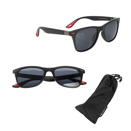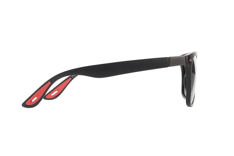 Polarizačné slnečné okuliare Schwarzwolf. Obrúčky a nožičky okuliarov sú v čiernej farbe s červenými detailmi na nožičkách, s oceľovými pántami zdobenými logom Schwarzwolf. Polarizačné okuliare znižujú nepríjemné oslnenie a únavu očí. Majú čierne sklá s ochranou UV 400 vhodné na outdoorové aktivity a šport. Okuliare sú dodávané v čiernom sáčku z mikrovlákna av pevnom praktickom púzdre Schwarzwolf. Súčasťou balenia je aj biela handrička na čistenie okuliarov z mikrovlákna, vhodná na sublimačnú tlač. Balené v darčekovej krabičke.