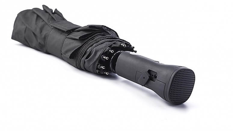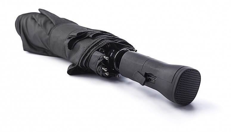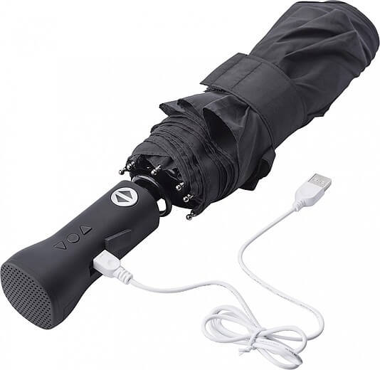 Pongee (190T) automatický, skladací dáždnik s ôsmimi panelmi. Otvára a zatvára sa automaticky. Kovový rám a plastová rukoväť. Rukoväť má integrovaný bezdrôtový reproduktor. Vstupné nabíjanie DC5V/1A. 3 Watt. 300 mAh batéria. Výdrž batérie až 2 hodiny.