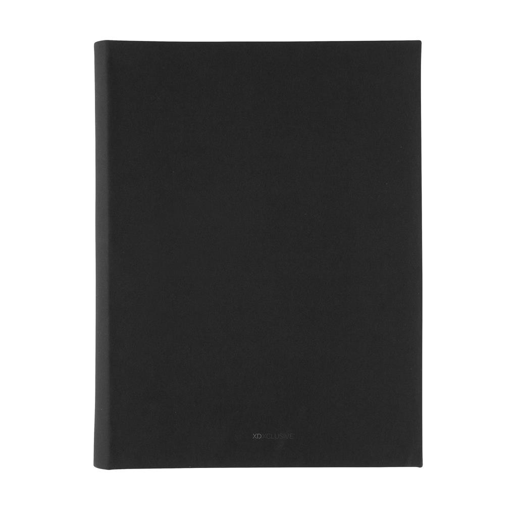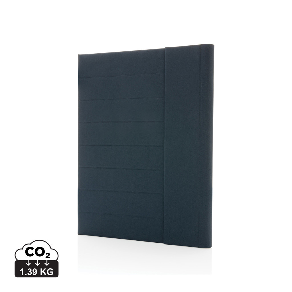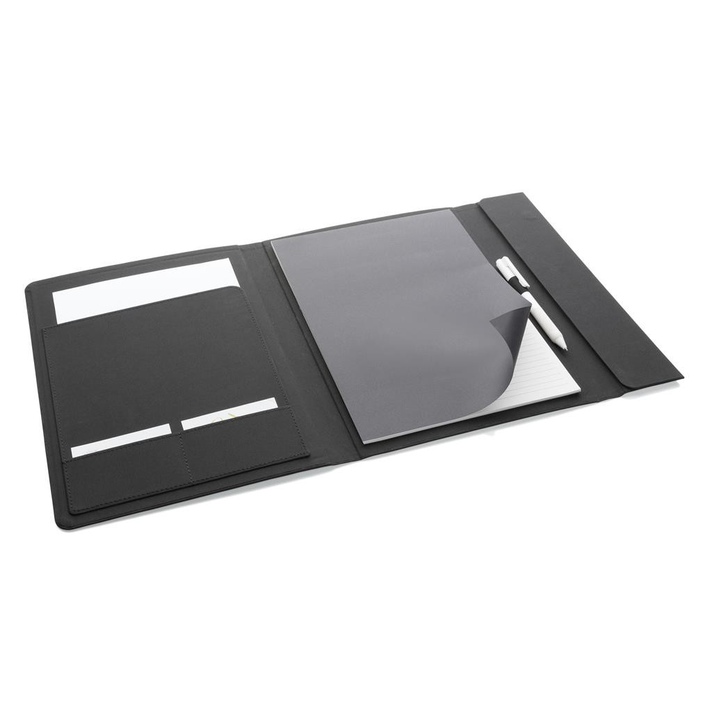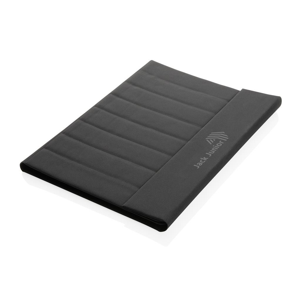 Moderné portfólio vo formáte A4 z kolekcie Impact. Vnútri obsahuje 1 veľké vrecko, 2 dodatočné malé vrecká, pútko na pero a vymeniteľný poznámkový blok z FSC recyklovaného linkovaného krémového papiera (20 strán, 70g/m2). Vnútorná aj vonkajšia časť je 100% vyrobená z recyklovaného polyesteru vrátane skenovateľnej zložky AWARE™ garantujúca obsah recyklátu. Na výrobu bolo využitých 3,2 500ml PET fliaš a bolo usporených 1,95 litrov vody. Z výťažku každého predaného produktu z kolekcie Impact je navyše prispených 2 % na podporu iniciatívy Water.org. Bez PVC.