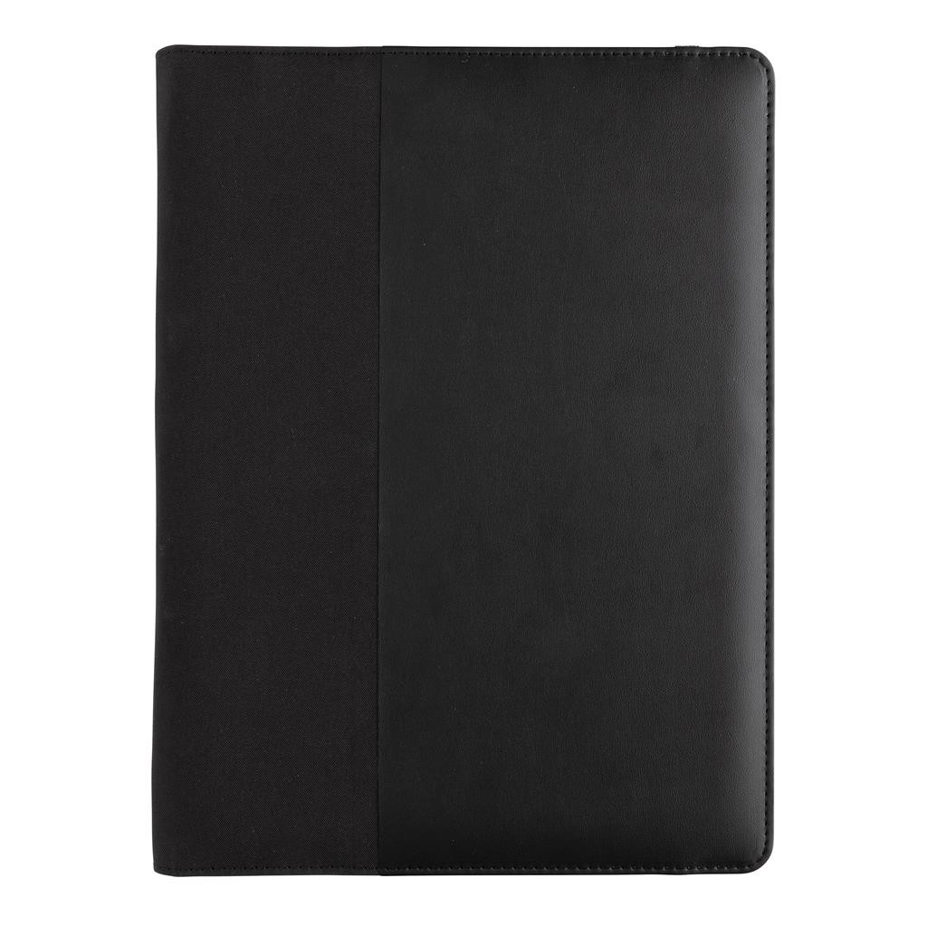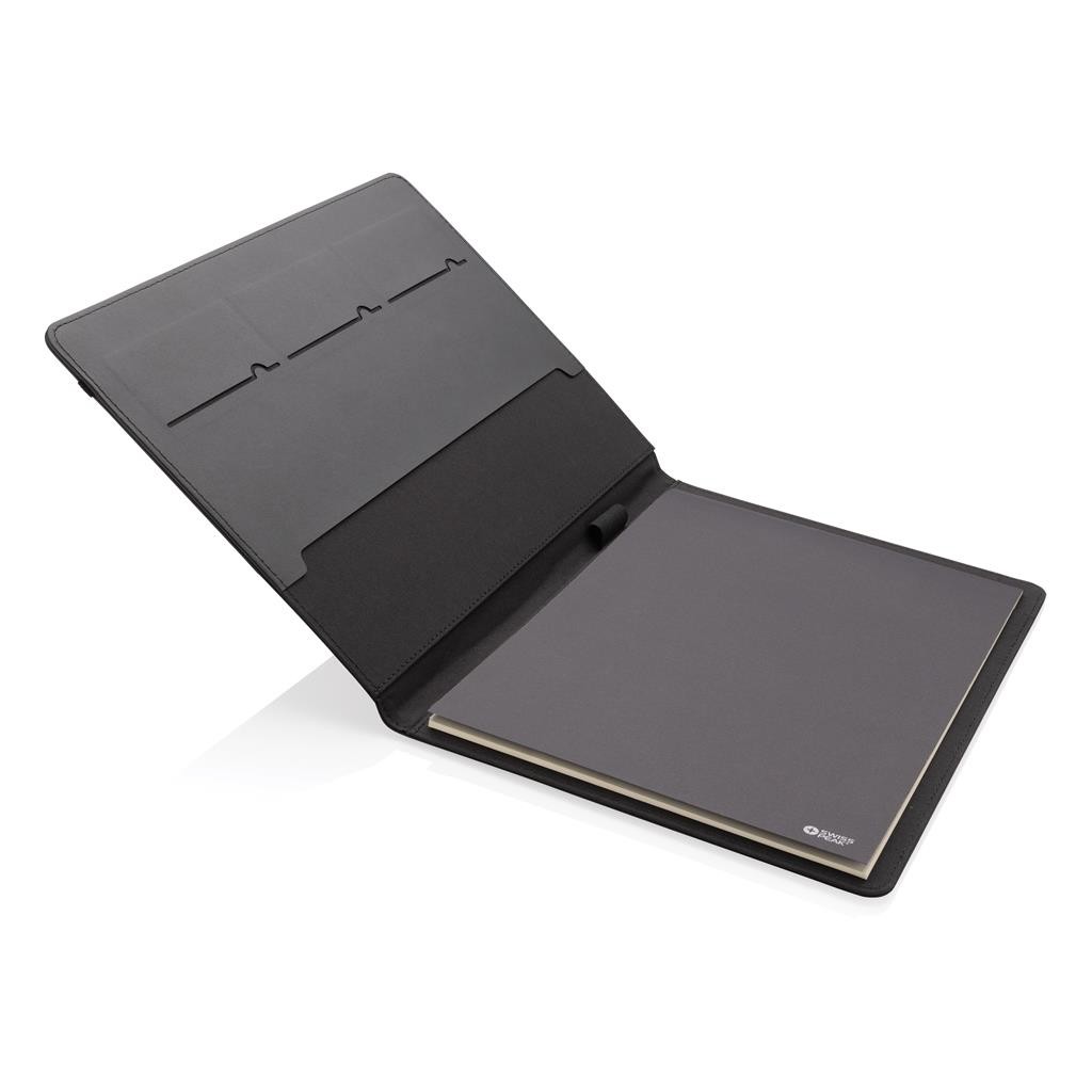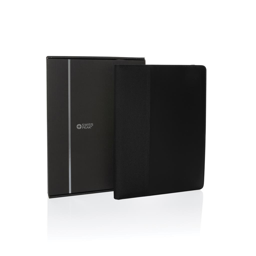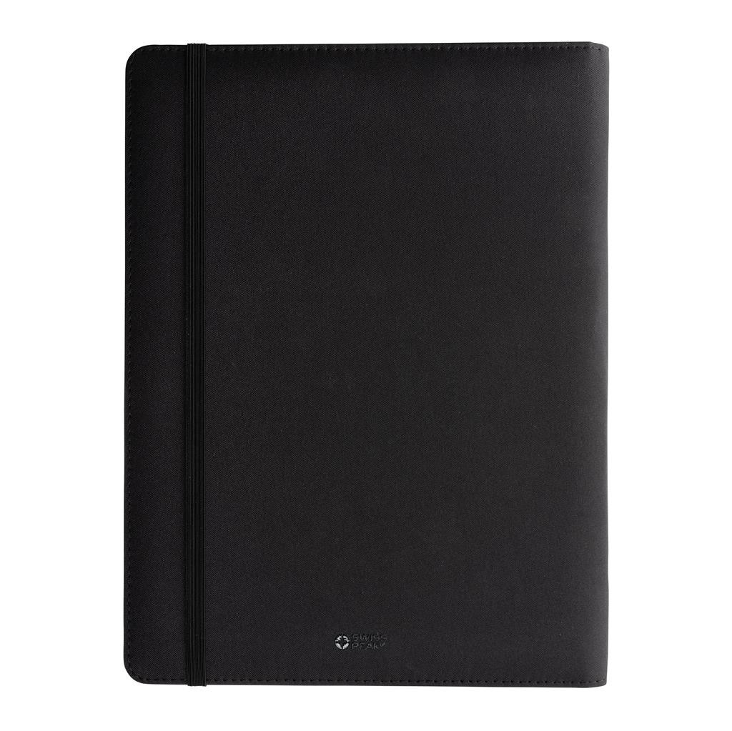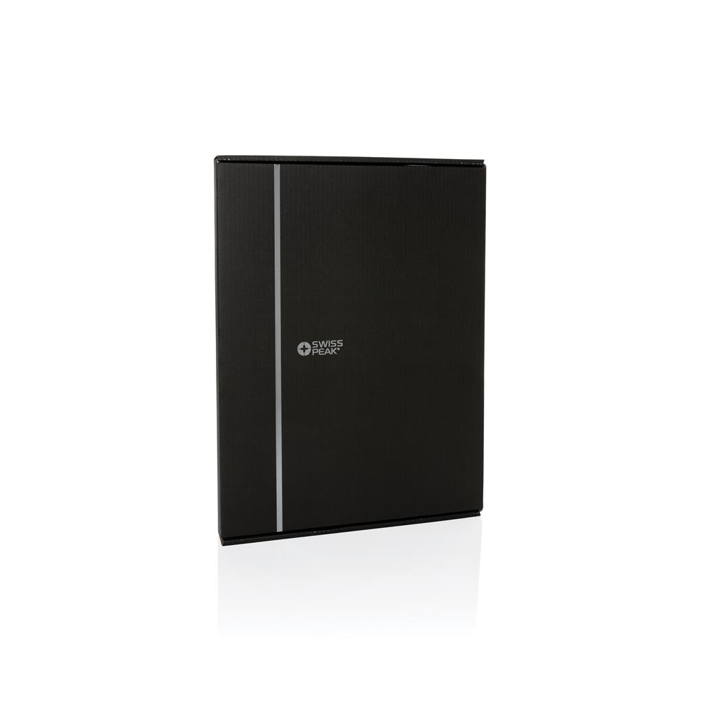 Portfólio značky Swiss Peak vo formáte A4 vyrobené z 300D recyklovaného polyesteru. Je vybavené pútkami na perá, sloty na vizitky, priestranným vreckom formátu A4. Obsahuje vymeniteľný poznámkový blok A4 s 20 stranami linkovaného krémového FSC® papiera (70g/m2). Vyrobené zo 100% recyklovaného polyesteru vrátane skenovateľnej zložky AWARE™ garantujúce obsah recyklátu. Balené v FSC® darčekovej krabičke.