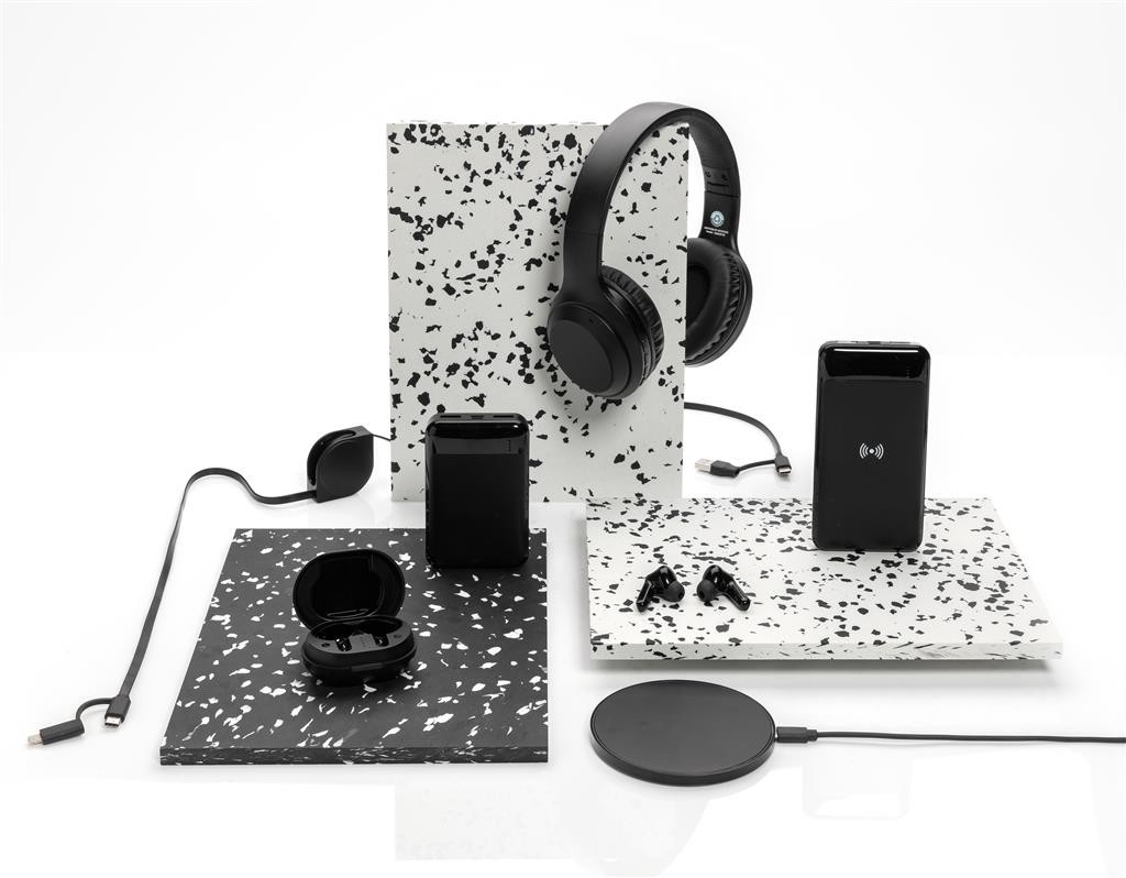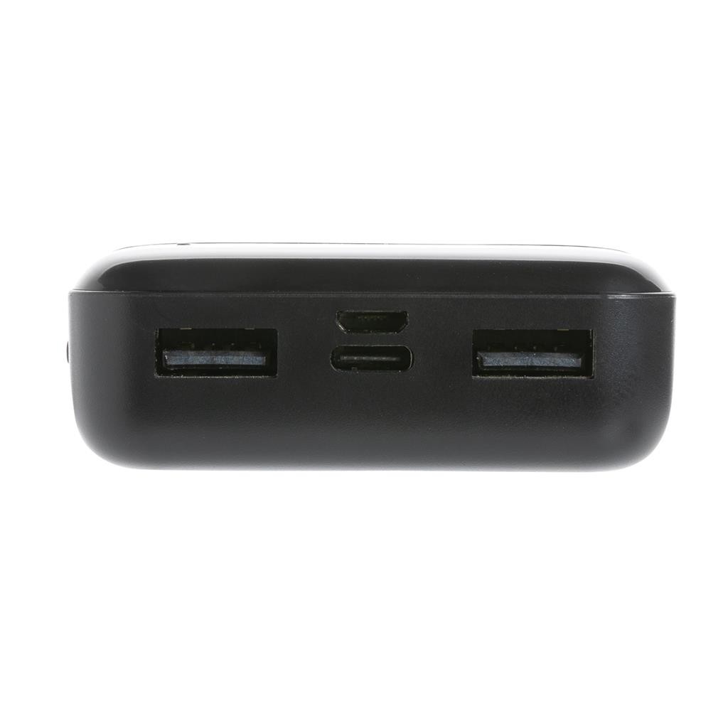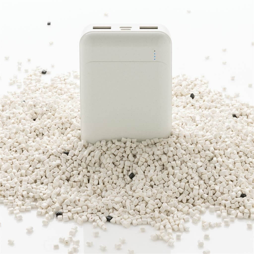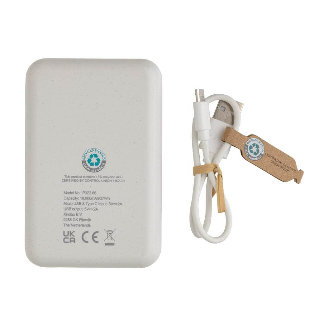 Vrecková powerbanka s kapacitou 10 000 mAh vyrobená z recyklovaného ABS plastu s RCS certifikáciou. RCS (Recycled Claim Standard) je globálny štandard, ktorý umožňuje overiť použitie recyklovaného materiálu v produkte naprieč celým dodávateľským reťazcom. Kvalitná lítium polymérová batéria série A s kapacitou 10 000 mAh plne nabije mobilný telefón až 4x. Svetelné indikátory stupňa nabitia. Micro USB vstup: 5V / 2A, USB C vstup: 5V / 2A. USB výstup: 5V / 2A. Vrátane micro USB nabíjacieho kábla z recyklovaného TPE. Výrobok je kompletne bez PVC. 1 batéria typu Li-poly v balení.