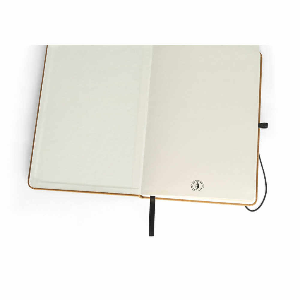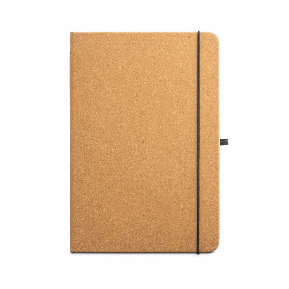 A5 notepad z recyklovanej kože so 192 slonovinovými stranami. Držiak pera (pero nie je súčasťou balenia), čierny elastický pás a páska so záložkou. Obsahuje vnútorné vrecko.140 x 210 mm