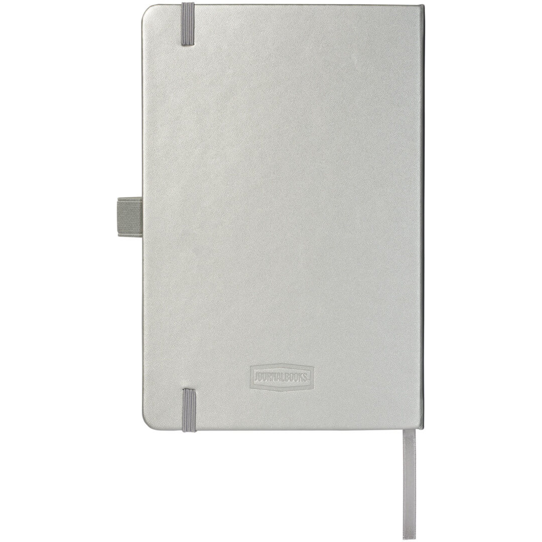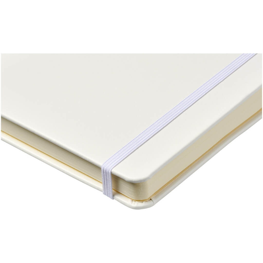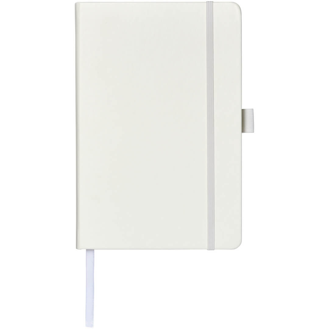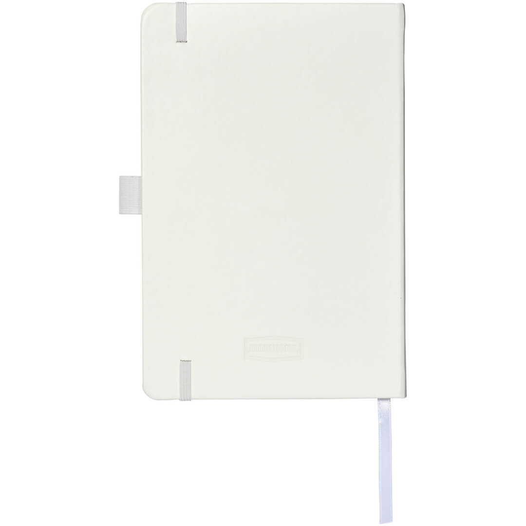 Viazaný poznámkový blok A5 Nova. Poznámkový blok s imitáciou kože A5 (14,2 cm x 21,4 cm) (koženka) s elastickým pásikom, záložkou, slučkou na pero a skladacie zadné vreckom. Obsahuje 96 listov řádkovaných krémových papierov s hmotnosťou 80 g / m2 a je ponúkaný v bielom puzdre Journalbook. Koženkový papier.