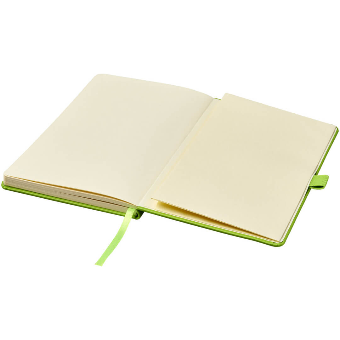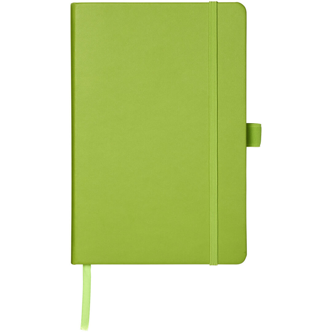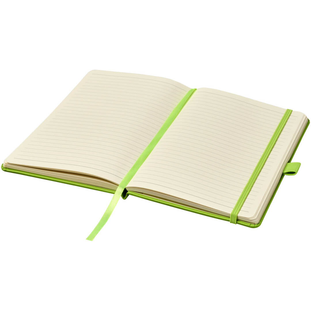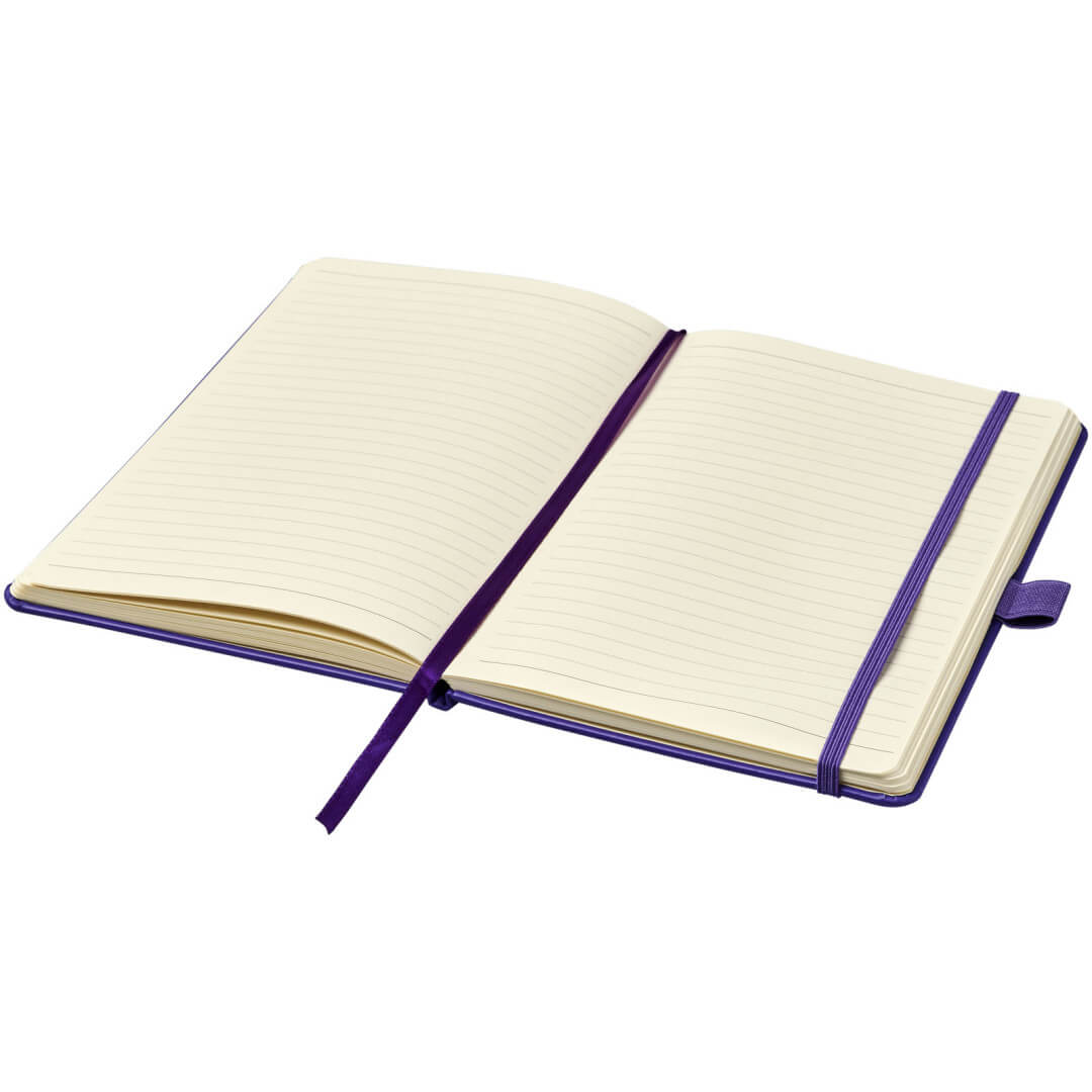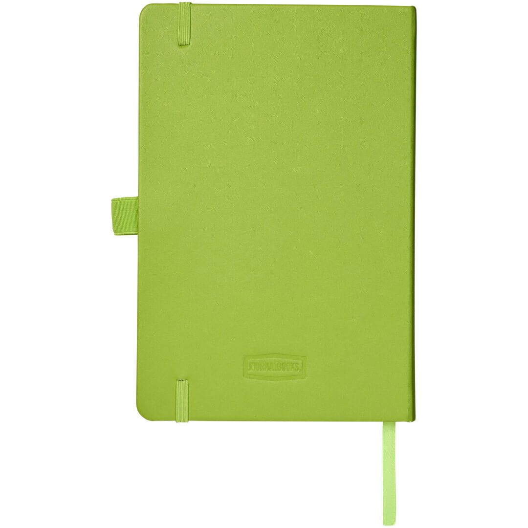 Viazaný poznámkový blok A5 Nova. Poznámkový blok s imitáciou kože A5 (14,2 cm x 21,4 cm) (koženka) s elastickým pásikom, záložkou, slučkou na pero a skladacie zadné vreckom. Obsahuje 96 listov řádkovaných krémových papierov s hmotnosťou 80 g / m2 a je ponúkaný v bielom puzdre Journalbook. Koženkový papier.