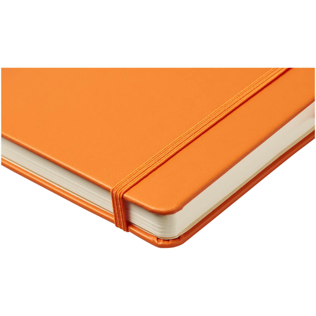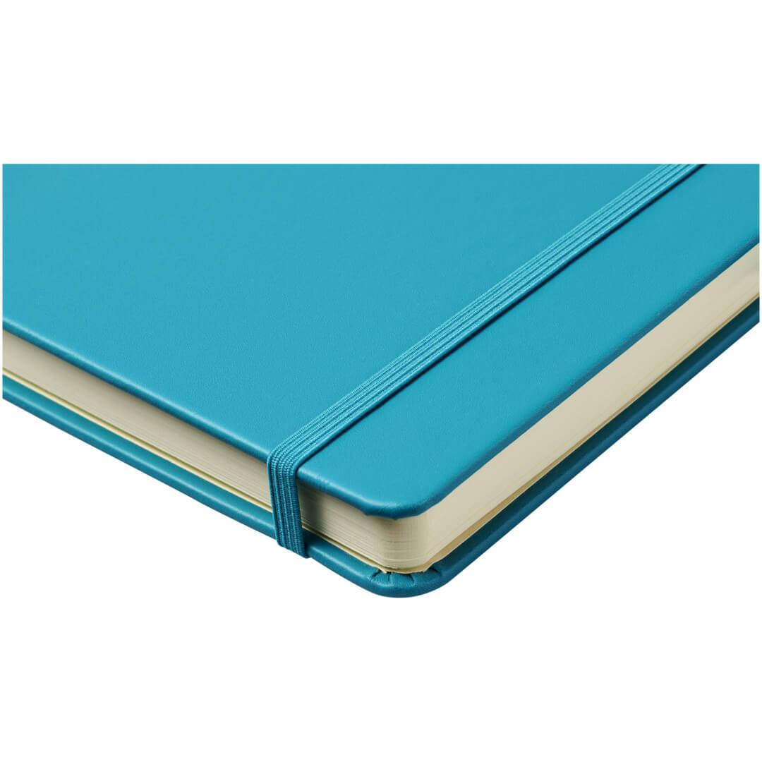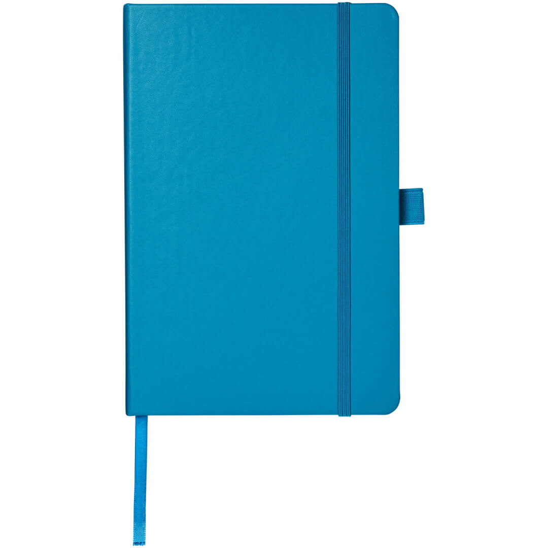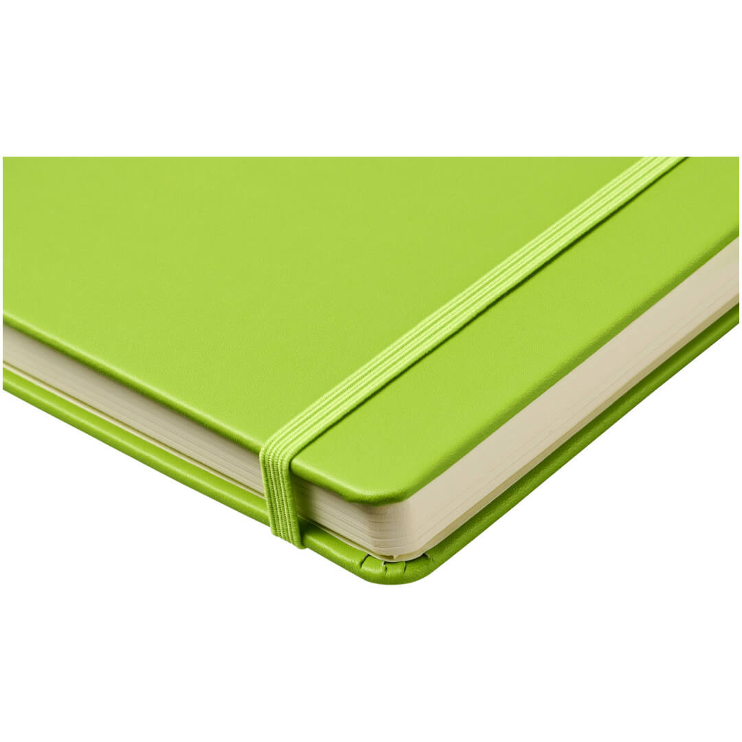 Viazaný poznámkový blok A5 Nova. Poznámkový blok s imitáciou kože A5 (14,2 cm x 21,4 cm) (koženka) s elastickým pásikom, záložkou, slučkou na pero a skladacie zadné vreckom. Obsahuje 96 listov řádkovaných krémových papierov s hmotnosťou 80 g / m2 a je ponúkaný v bielom puzdre Journalbook. Koženkový papier.