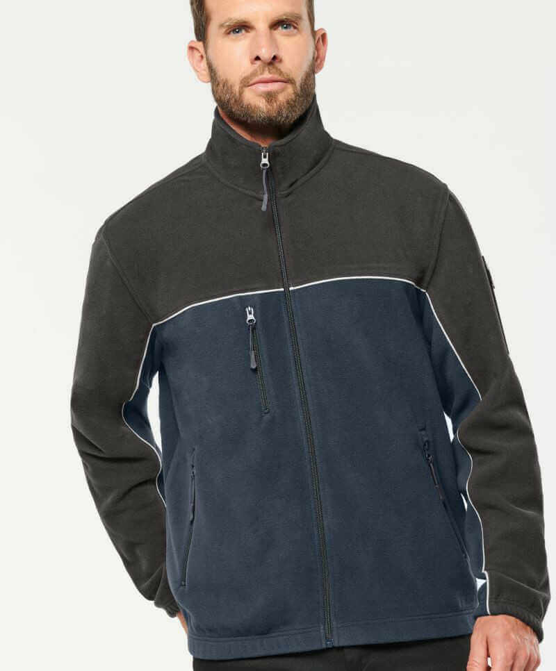 Krčná lemovka v kontrastnej farbe, lem a manžety s elastanom, 2 bočné vrecká a 1 náprsné vrecko so zipsom, elastický držiak na perá s 3 priehradkami na ľavom rukáve, lemovanie v kontrastnej farbe, pútko na zavesenie, štítok TearAway