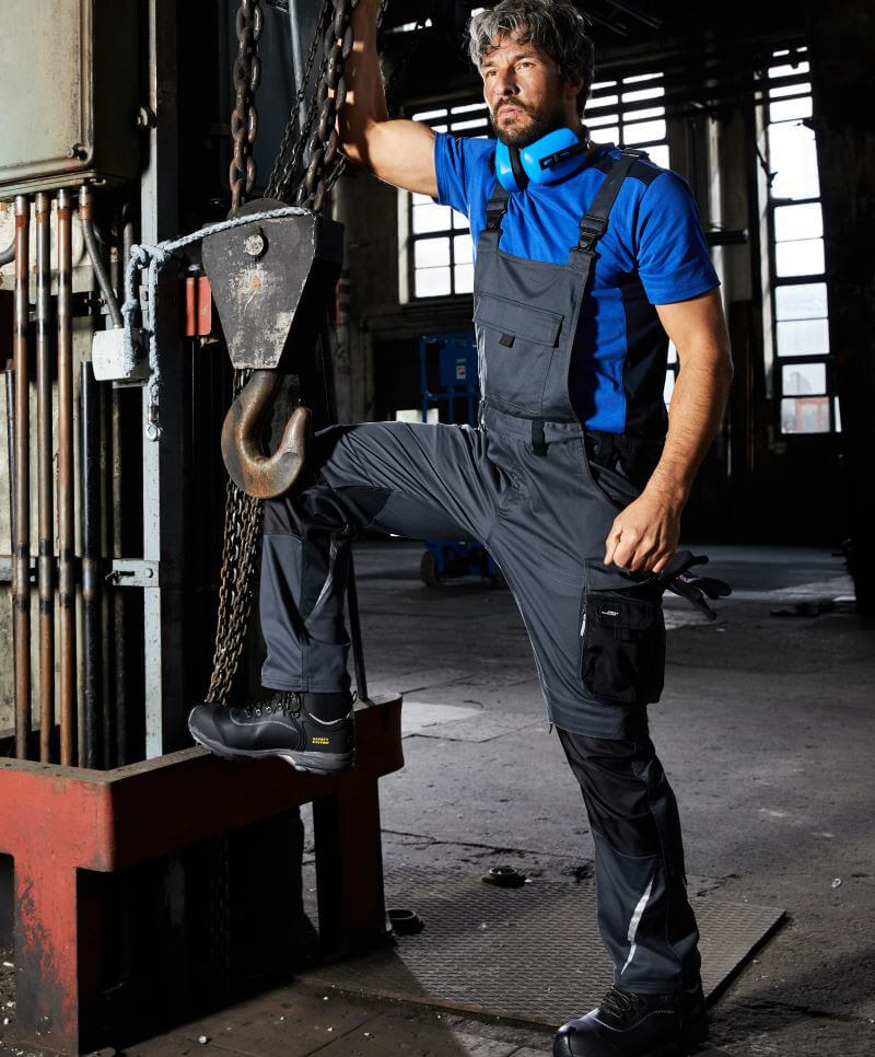 Pánske pracovné nohavice s nastaviteľnými, elastickými ramienkami, elastický pás s pútkami na opasok, zipsy YKK, zasúvacie vrecká, niekoľko vreciek na náradie, vrecká na kolená vystužené Cordura®, priestranné vrecko so zipsom vo vnútornej strane nohavíc, odolný proti roztrhnutiu, troj-pásmový šev, reflexné prvky (bez ochrannej funkcie). Možno prať na 60°, vhodné na sušenie v sušičke.