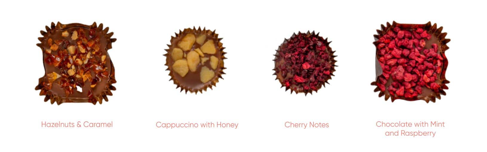 Osem čokoládových praliniek Gold Cup s pozoruhodnými náplňami: čerešňové tóny, cappuccino s medom, lieskovými orieškami a karamelom, čokoláda s mätou a malinou.