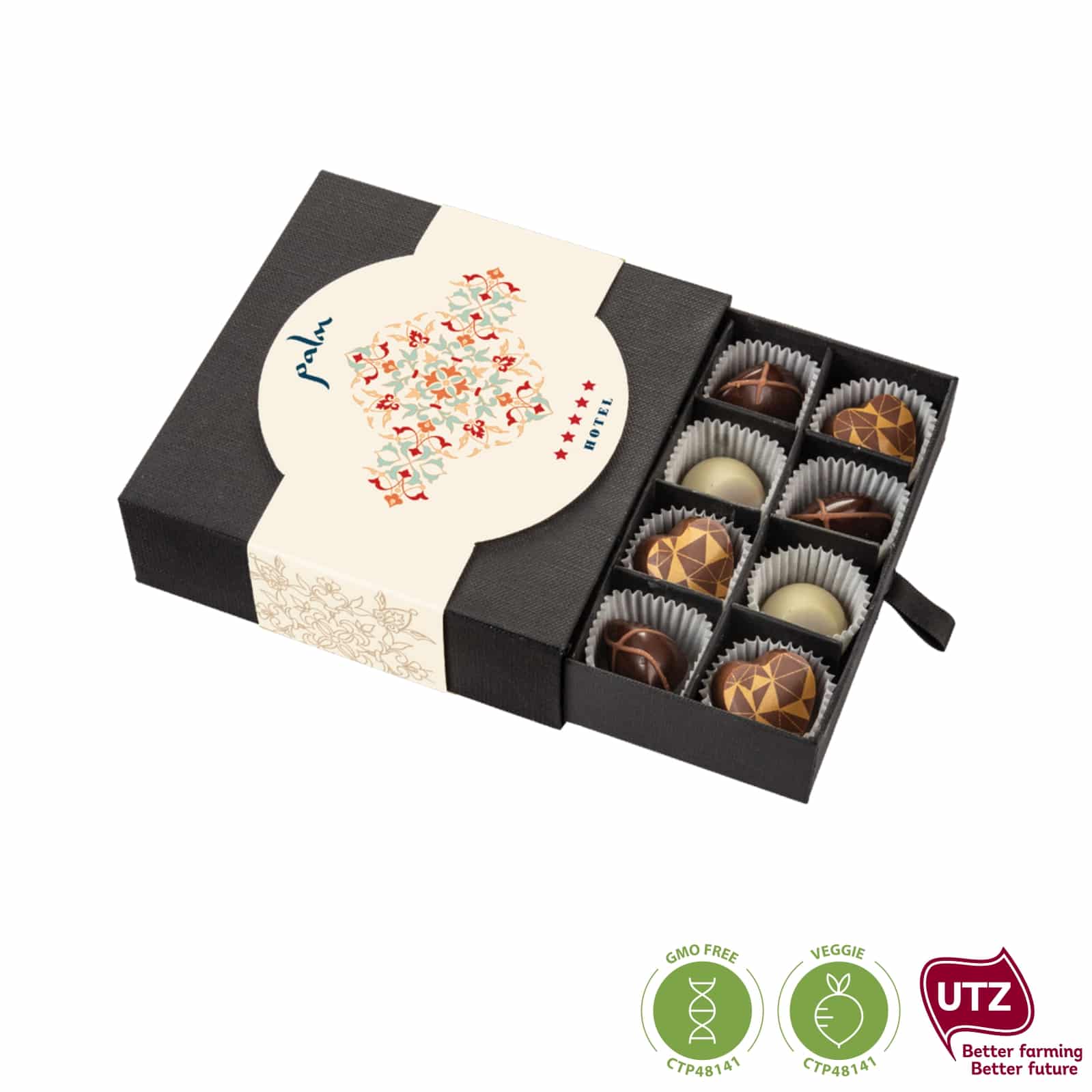 Pralinky Sweets Moments obsahujú 16 praliniek v 3 príchutiach. Sú v čiernej krabičke na opätovné použitie podľa princípu „zero waste“. Má štandardne biely papierový štítok, kraftový štítok je voliteľný.