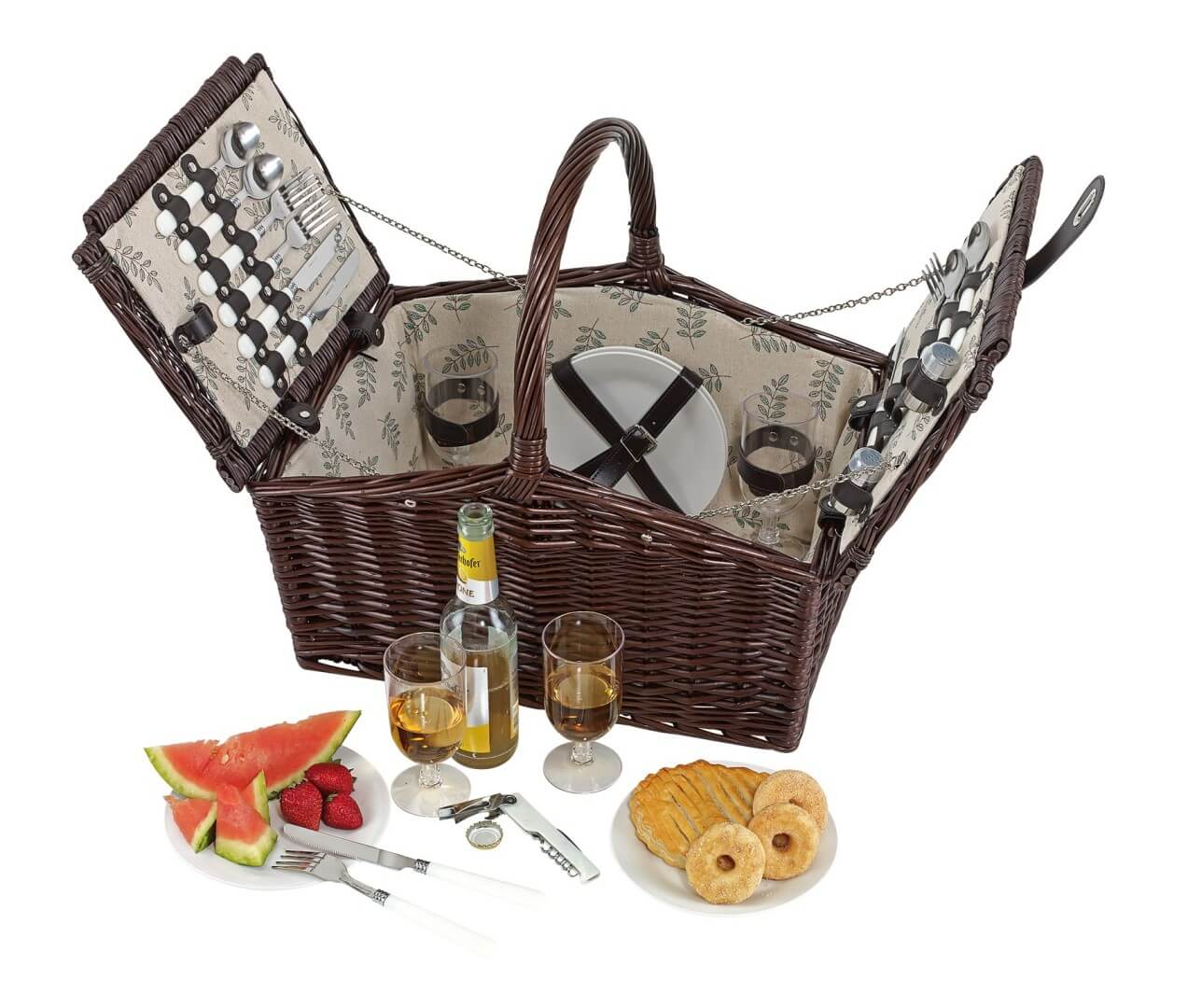 Prútený piknikový kôš "Richmond Park" pre 4 osoby: obsahuje príbory z ušľachtilej ocele s plastovou rukoväťou, keramické taniere, plastové poháre na víno, 1 nôž, soľničku a koreničku; s upínacími popruhmi na vnútornej strane, podšívka vyrobená zo 100% ľanu, s rukoväťou a otočným zámkom na vonkajšej strane