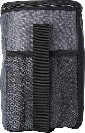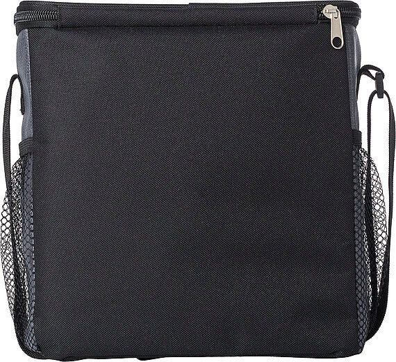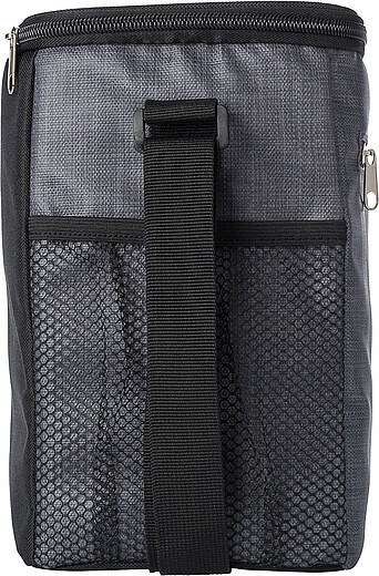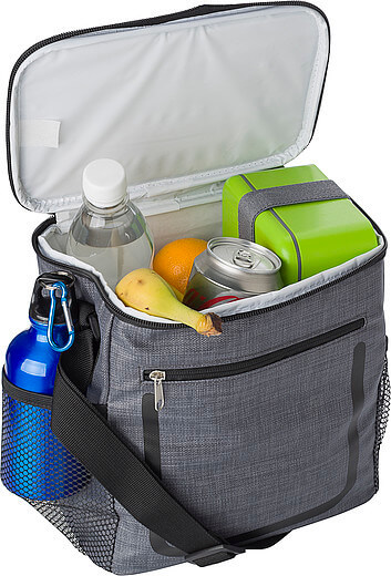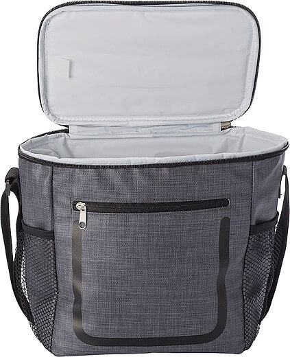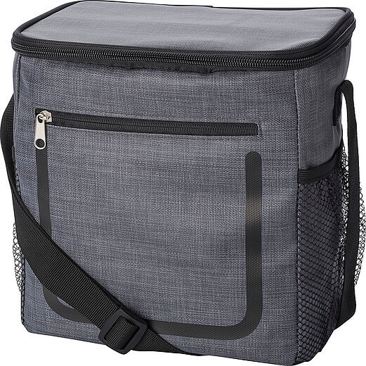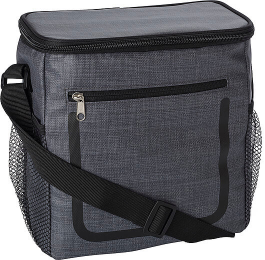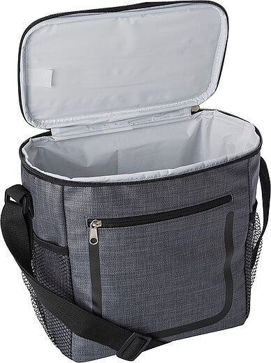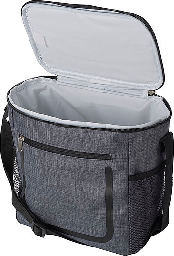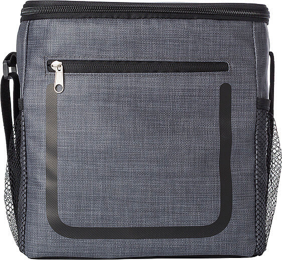 PU chladiaca taška s predným vreckom na zips a sieťovými priehradkami na oboch stranách. Interiér je obložený bielou chladnou fóliou. Taška má nastaviteľný ramenný popruh.