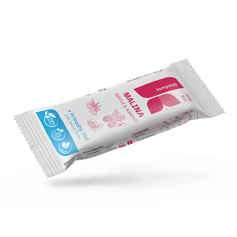Tyčinka plná prírodnej energie z datlí, orechov a kokosu, obohatená o prírodný jód na podporu správnej funkcie štítnej žľazy. Vhodná pre vegánov, bez lepku, laktózy a sóje. Datle dodávajú rýchlu energiu, orechy a kokos zabezpečia zdravé tuky, vlákninu a minerály. V ponuke v troch príchutiach: malina (datle, kakao), pistácie (datle, arašidy), extra kakao (datle, lieskovce). (uveďte do poznámky pri objednávke)