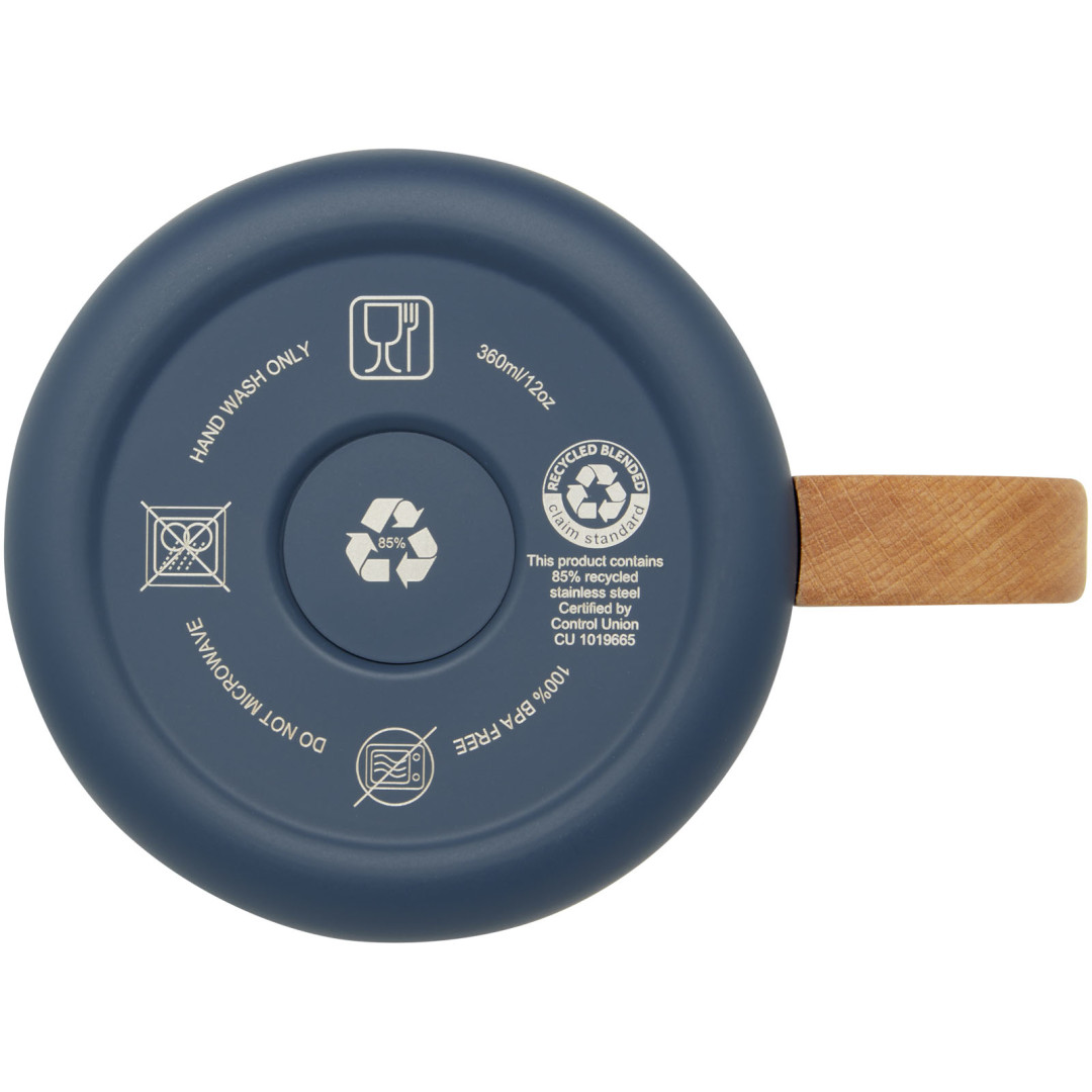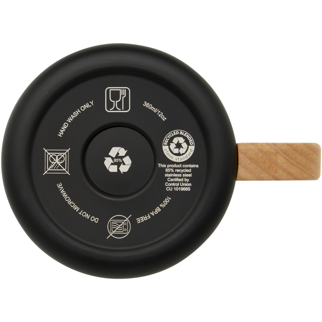 Hrnček Bjorn je vyrobený z recyklovanej nerezovej ocele s certifikáciou RCS a rukoväť je vyrobená zo zodpovedne získaného bukového dreva. Medená vákuová izolácia v hrnčeku pomáha udržať nápoje v ideálnej teplote po dlhú dobu. Tento hrnček je skvelou alternatívou k tradičným hrnčekom, navrhnutý tak, aby zabránil prenosu tepla na vonkajšiu stranu hrnčeka. Testované a schválené podľa nemeckej legislatívy pre bezpečnosť potravín (LFGB) a na obsah ftalátov podľa predpisov REACH. Kapacita: 360 ml. Neobsahuje BPA.