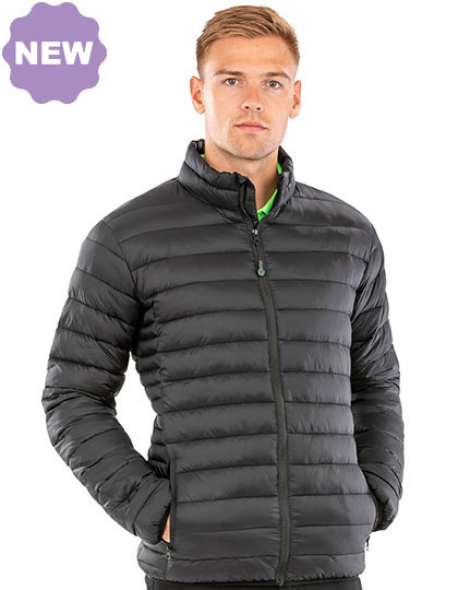 Vonkajšia strana + podšívka: 100% recyklovaný nylon, polstrovanie: 100% recyklovaný polyester (260 g/m²). Ľahká, vodeodolná, priedušná, odolná proti vetru. Teplá polstrovaná bunda s kontrastnými vodorovnými dielmi v podpazuší. Odolný golier na zips s ochranou brady a jazdcom. Čierna elastická čierno lemovaná manžeta a lem. Polyesterová vata mäkká na dotyk. Vrecká na zips. Vnútorné vrecká. Závesné pútko. Módny prešívaný design. Recyklovaný materiál s použitím ekologických materiálov z recyklovaných plastových fliaš a priemyselného odpadu, ktorý je udržateľnou alternatívou bežných priadzí. Vyrobené z 18 (1litrových) plastových fliaš. Na konci životnosti recyklovateľné. Bez štítku.