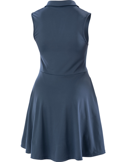 Recyklovaný polyester. Klasický golier, dámske športové šaty bez rukávov ideálny pre tenis a všetky športy na kurte. Hi-Tech streč pre pohodlie a udržanie tvaru. Plné rozpätie sukne s bočnými vreckami. Princesové lemovanie. Bez zipsu na jednoduché nosenie. Viazané prieramky. Vypasovaný golier. Priedušný. Rýchloschnúca tkanina. Bez visačky.