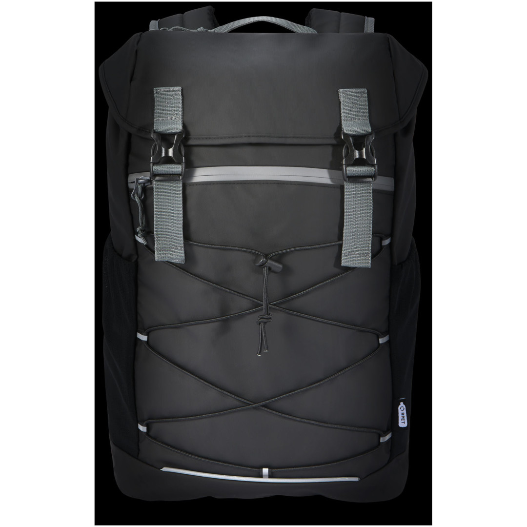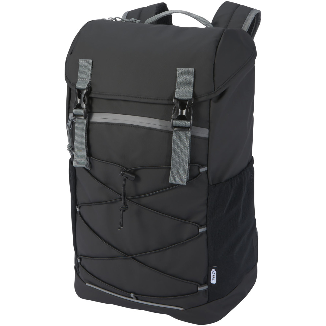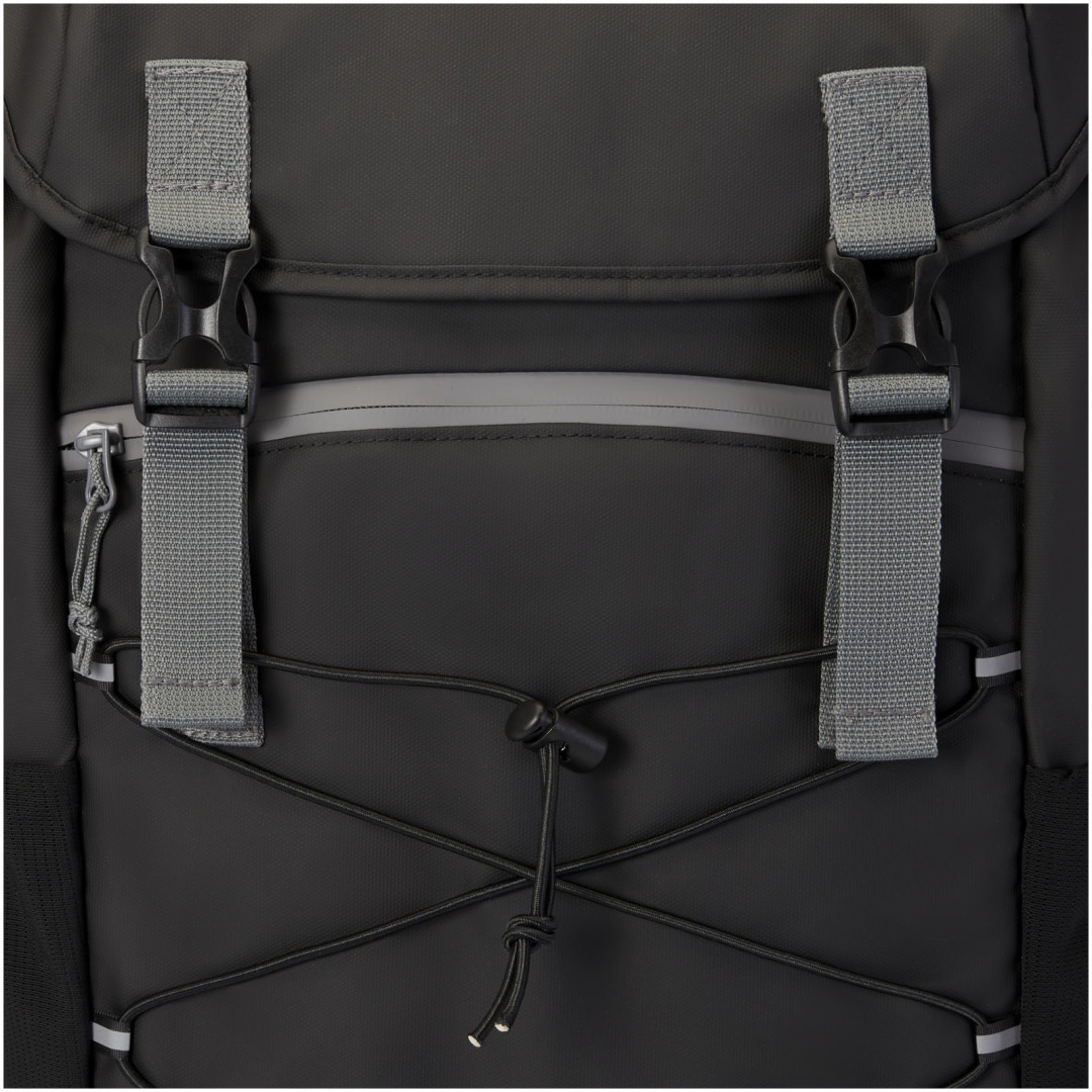 Vodeodolný batoh na notebook vyrobený z GRS certifikovaných recyklovaných materiálov, vrátane zipsov. Obsahuje priestrannú 15,6” priehradku na notebook so sťahovacou šnúrkou a nastaviteľnými prackami, ktoré maximalizujú úložný priestor pod ohybným krytom. Tento batoh má niekoľko vreciek, vrátane predného vrecka na zips s elastickými šnúrkami na uloženie a organizáciu a reflexným lemovaním na zviditeľnenie. Vytvarovaná a polstrovaná podložka a nastaviteľný hrudný popruh umožňujú pohodlné nosenie aj pri plnom naložení. Z recyklovaných materiálov GRS je vyrobená hlavná tkanina, podšívka, popruhy a zipsy. Kapacita: 23 litrov. Neobsahuje PVC.