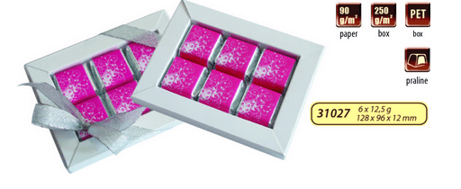 Pralinky s potlačeným obalom v papierovej krabičke so stuhou, Druhy praliniek: belgická čokoláda s originálnymi belgickými náplňami.