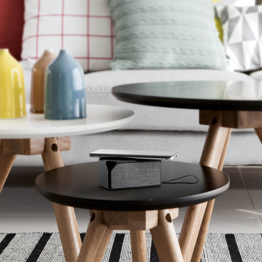 ABS reproduktor s gumovou a látkovou úpravou vpredu. Vďaka sofistikovanému dizajnu má tento reproduktor autonómiu až 2 hodiny, s prenosom Bluetooth 5'0 a výkonom 3 W. Ďalej disponuje funkciou bezdrôtovej nabíjačky s výkonom 5 W, vstupom 5 V/2 A a batériou 300 mAh. Súčasťou je nabíjací kábel micro USB. Dodávané v darčekovej krabičke. 108 x 56 x 54 mm