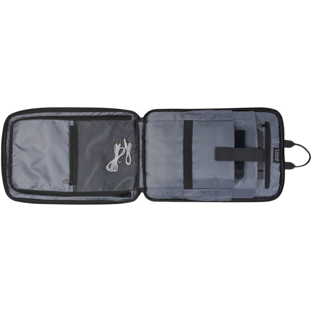 Batoh Rise je vyrobený z odolného recyklovaného polyesteru 900D GRS a má všetky potrebné funkcie. Obsahuje polstrované puzdro na notebook vhodné pre 15,6" notebook, extra puzdro na malý notebook alebo tablet a vrecká na zips na menšie predmety. Vnútri je navyše elastický pásik na umiestnenie fľaše s vodou. Na zadnej strane batohu je pohodlný elastický popruh, ktorý uľahčuje pripevnenie k vozíku.
