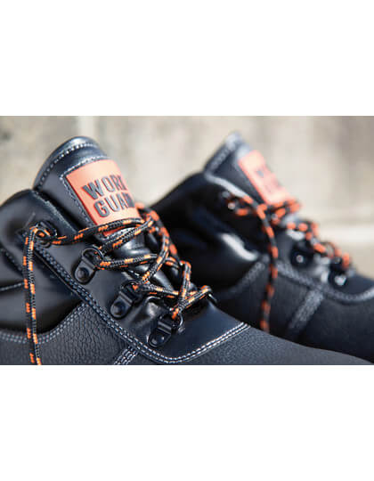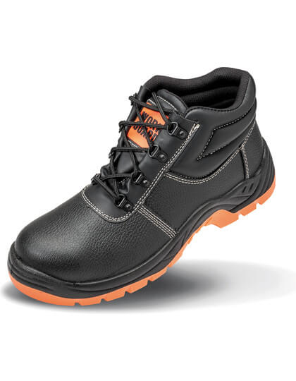 Bezpečnostná obuv kategórie SBP | Oceľová ceruzka a medzipodrážka | Cierna táta s leskom | Tkanicky: All Orange, krabica obsahuje aj rezervné sady vo farbách Orange/Black a All Black | Zvršok: zvršok z ciernej embosovanej štiepanej kože | Vnútro členka: vnútorná podšívka, cierna sitovina | Špicka: cierny materiál EVA | Podrážka: polyuretán s dvojnásobnou tuhosťou vo farbe Black/Orange | Golier zvršku: cierny vypolstrovaný | spĺňa EN 20345:2011 SBP