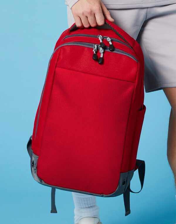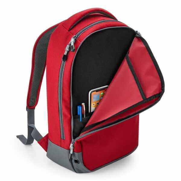 100% polyester (600D/420D), vodeodolný materiál, polstrovaná rukoväť, ergonomické ramenné popruhy s držiakmi na bezdrôtové slúchadlá, priedušný polstrovaný chrbtový, panel zo sieťoviny, hlavná priehradka so širokým otváraním na zips, predné vrecko s organizérom, vnútorné vrecko, vonkajšie vrecko na fľašu, kovové ventilačné oká, štítok TearAway pre jednoduchú zmenu značky, kapacita: 23 litrov, rozmery: 30x50x18 cm, max. plocha pre výšivku: 20 obrúčok, max. tlačová plocha: 20x30 cm