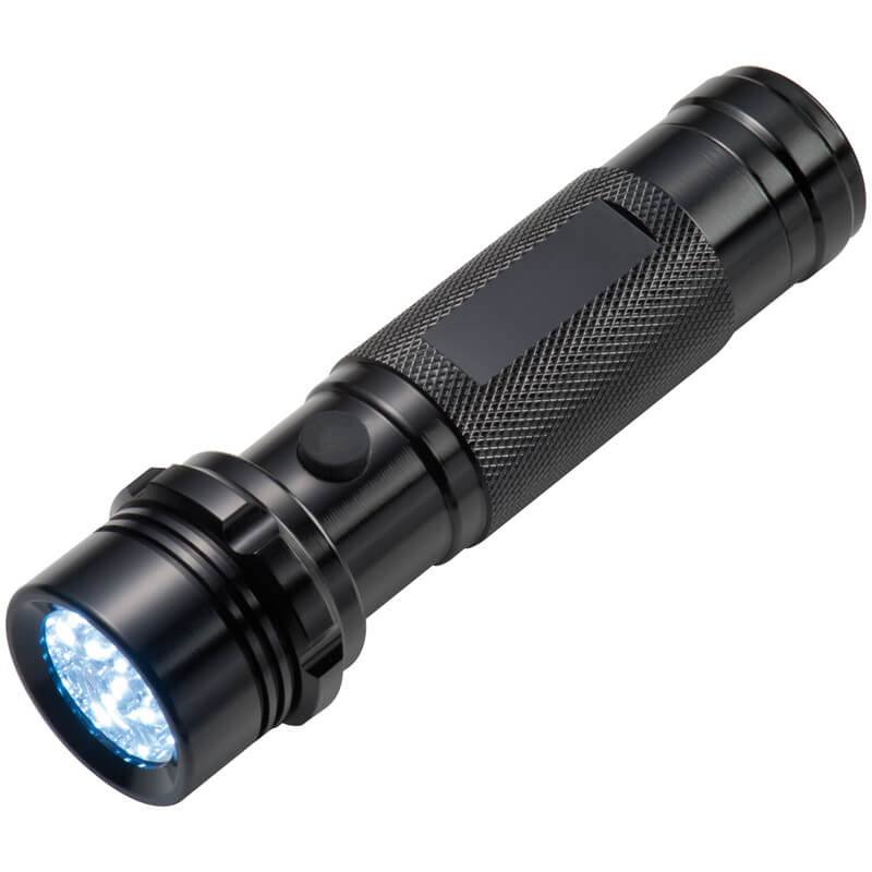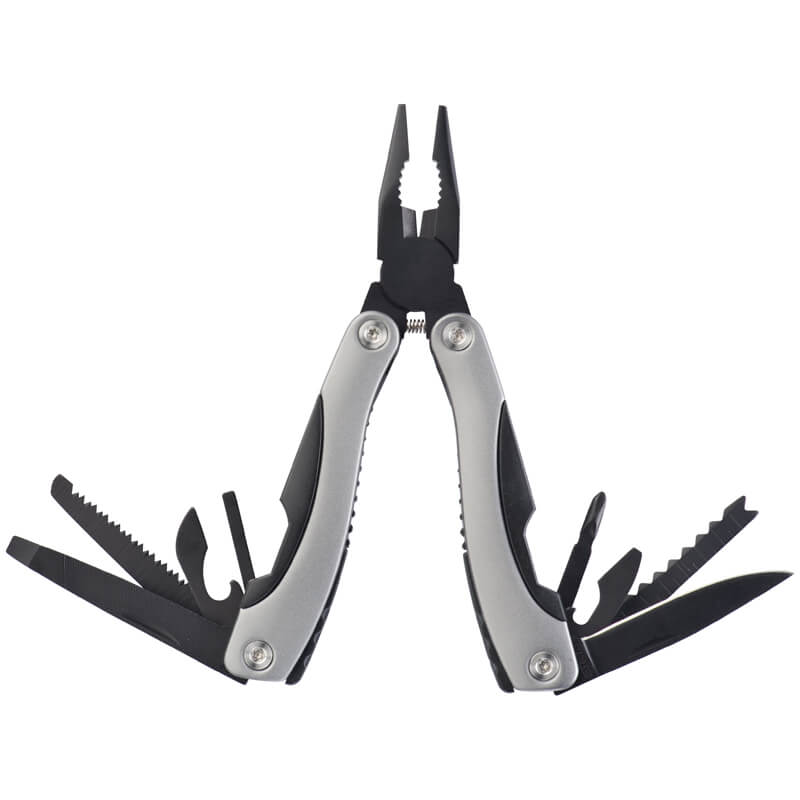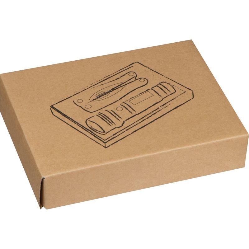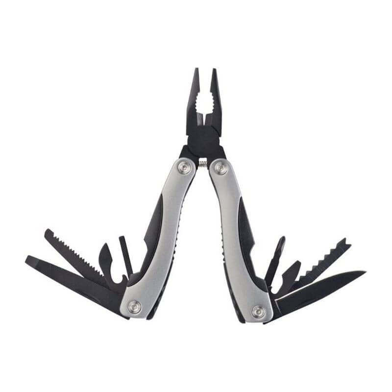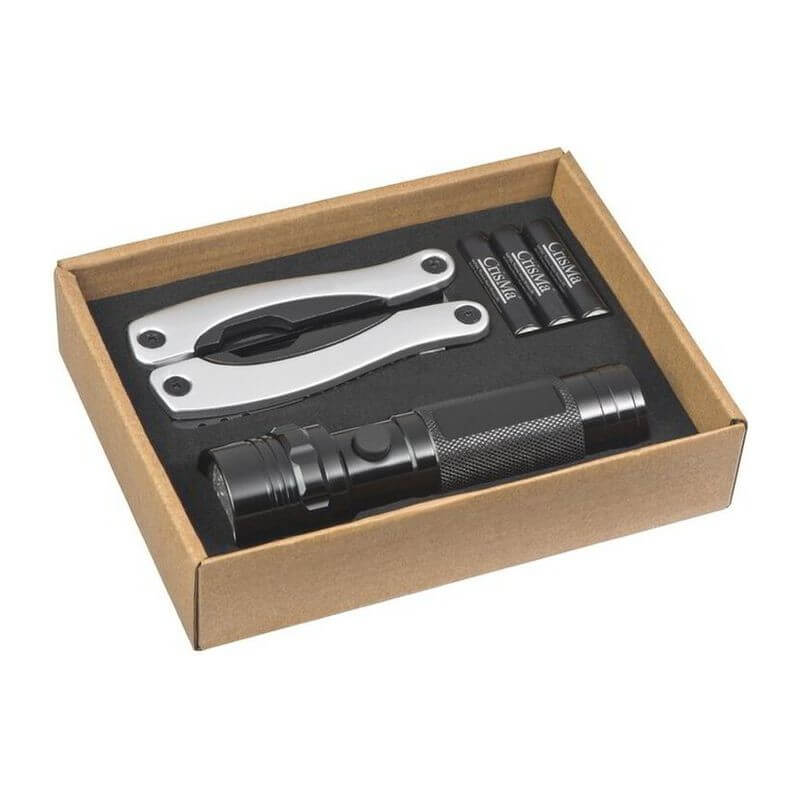 Súprava baterky z masívneho kovu s 14 LED diódami a multifunkčného sady náradia s kliešťami, pílou, otváračom na konzervy, pilníkom na nechty, plochým skrutkovačom, krížovým skrutkovačom, extra ostrým nožom v čiernej darčekovej krabičke. Vaše logo umiestníme gravírovaním.