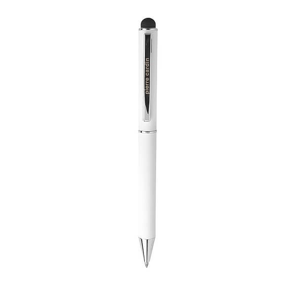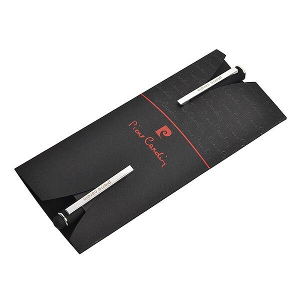 Luxusná sada rollera a guľôčkového pera Pierre Cardin s hliníkovým telom a gumovou povrchovou úpravou, ktorá je veľmi príjemná na dotyk. Perá majú strieborné detaily a stylus. Roller obsahuje modrú náplň značky Schneider s hrotom 0,5 mm, guľôčkové pero kvalitnú modrú náplň s hrotom 1 mm. Balené v luxusnom vrecku Pierre Cardin, dodávané s certifikátom pravosti. Pero aj roller majú registrovaný design. Rozmery: roller 1 × 13,5 cm, guľôčkové pero 1 × 14 cm, balenie 7 × 15,5 cm.